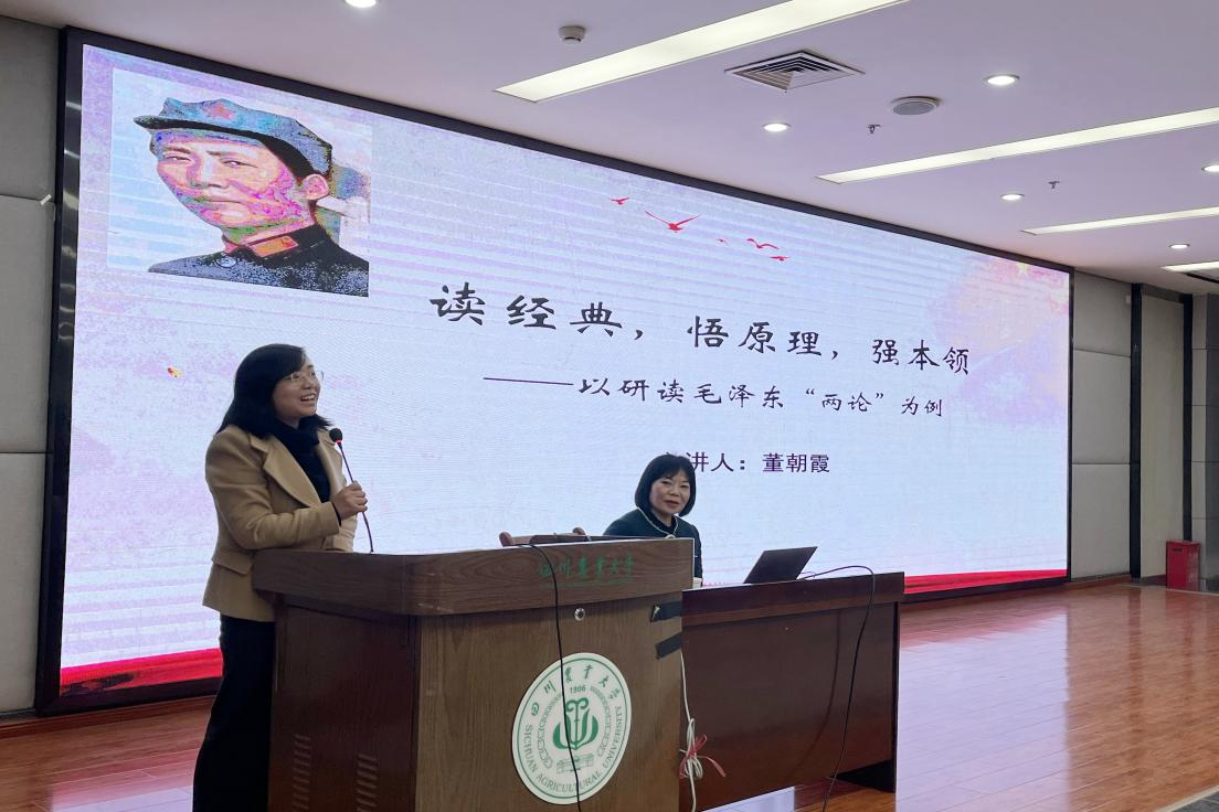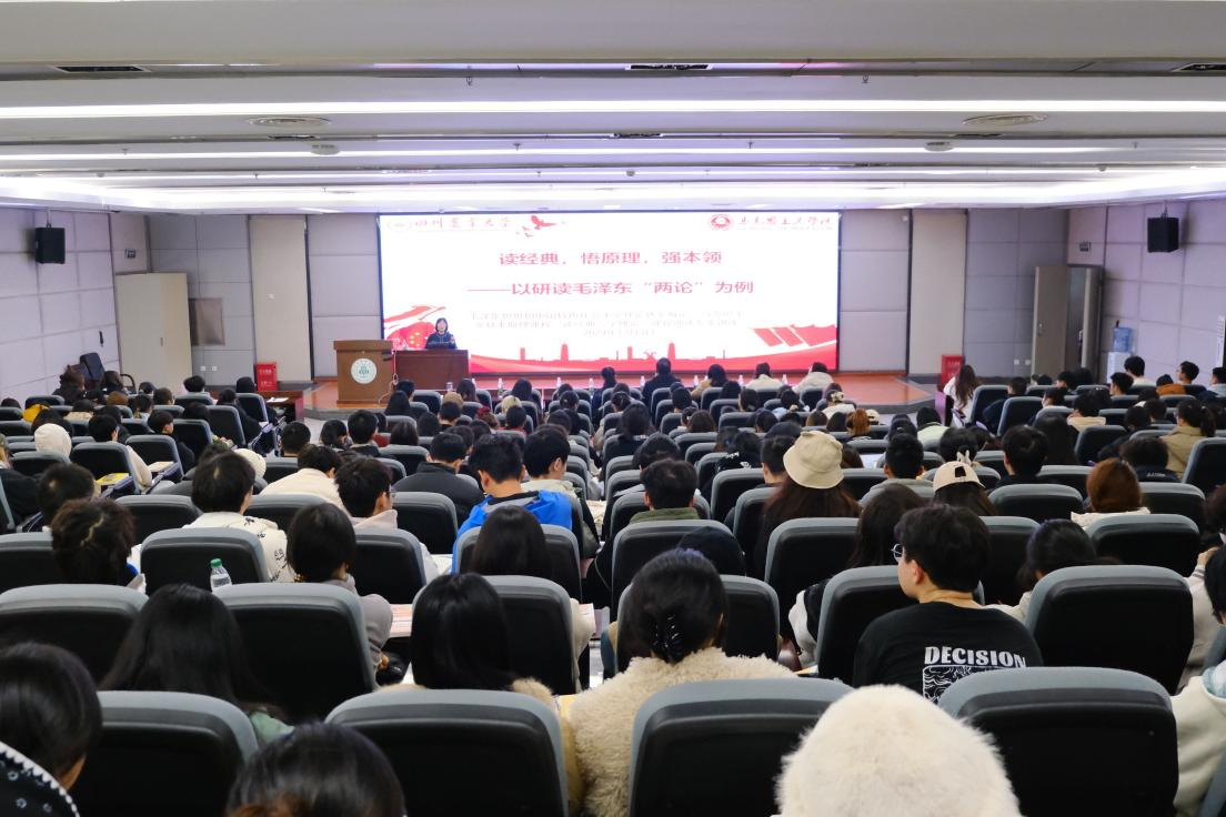 在这节独特的思政课堂上,课程组邀请到了四川师范大学董朝霞教授,以“读经典,悟原理,强本领——以研读毛泽东‘两论’为例”为题,为学生们点亮了探索毛泽东哲学思想的智慧之光。课堂上,董朝霞教授从“在历史背景中系统研读原著、在历史事实中领悟基本原理、在社会主义实践中展现真理、在研读领悟中强化过硬本领”四个方面深入解读了毛泽东《实践论》《矛盾论》的写作背景、哲学内涵、理论价值。讲座的最后,董朝霞教授寄语同学们:广大青年既是追梦者,也是圆梦人,希望大家努力通过读经典,悟原理,掌握看家本领,练就“真功夫”!