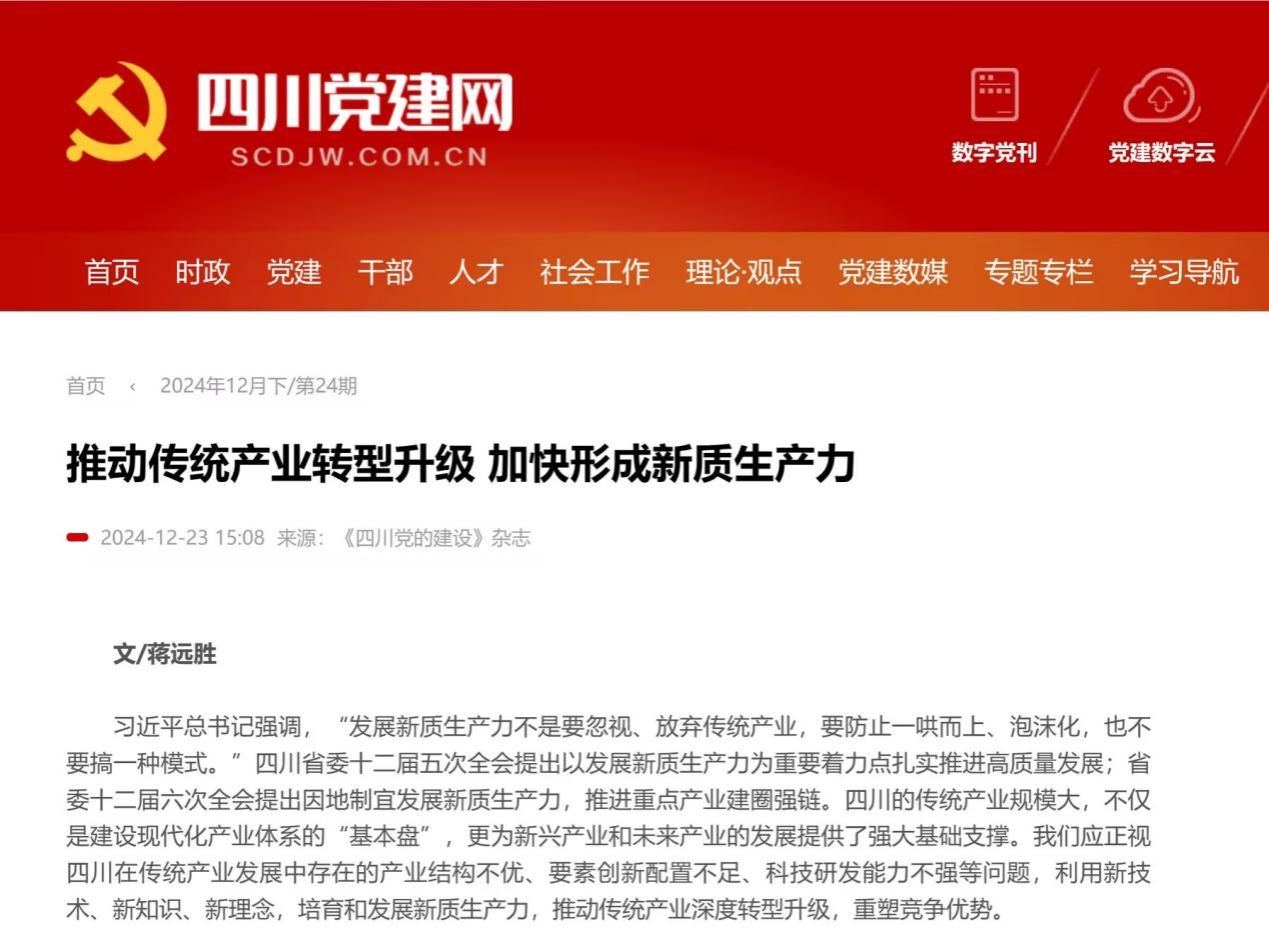 12月23日,《四川党的建设》发表我院党委书记蒋远胜理论文章《推动传统产业转型升级 加快形成新质生产力》,该文章以习近平总书记关于新质生产力的重要论述为总起,以四川省委十二届五次全会提出以发展新质生产力为重要着力点扎实推进高质量发展;省委十二届六次全会提出因地制宜发展新质生产力,推进重点产业建圈强链为背景,分析四川在传统产业发展中存在的具体问题,提出四川应利用新技术、新知识、新理念,培育和发展新质生产力,推动传统产业深度转型升级,重塑竞争优势。