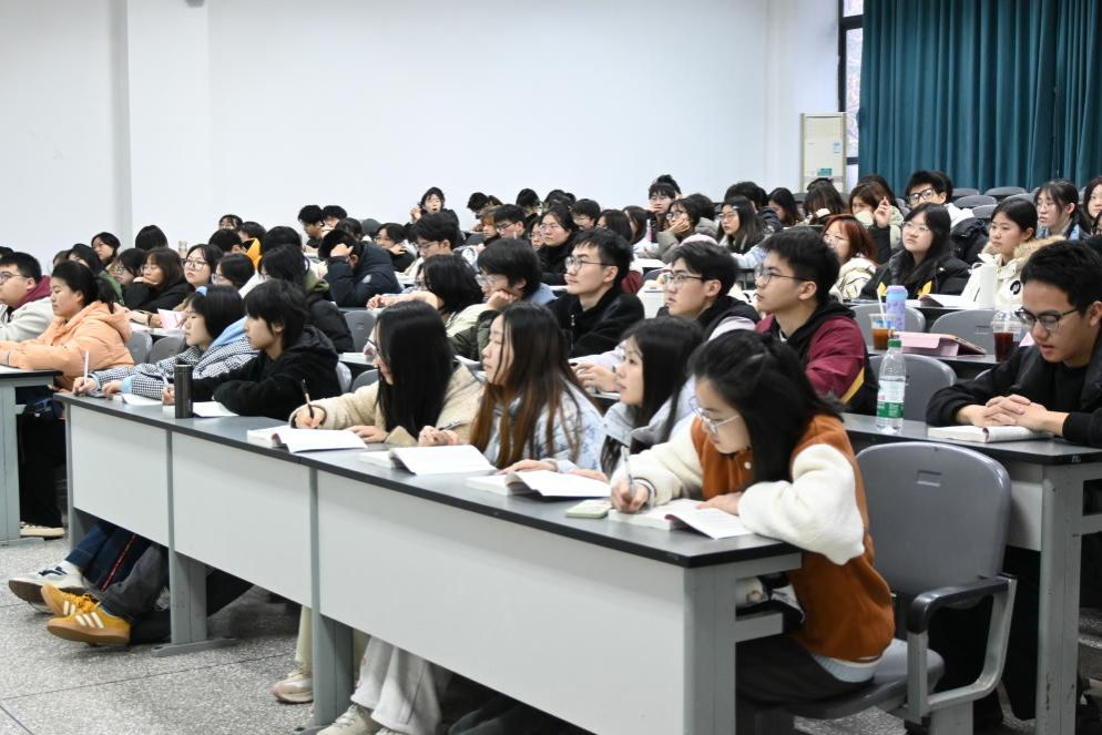 杨颖聚焦习近平文化思想,从时代背景、丰富内涵以及战略意义三个层面深入浅出进行讲解。他从世情、国情、党情三个角度分析,指出当今世界之变、时代之变、历史之变正以前所未有的方式展开,青年学子要学习领悟习近平文化思想的丰富内涵,以此武装头脑,汲取思想力量,以中国式现代化全面推进中华民族伟大复兴。他总结了习近平文化思想中关于文化自信、意识形态、文化强国、文明交流互鉴的重要论述,希望同学们真正做到明体达用、体用贯通。他从坚持中国共产党的文化领导权、谱写马克思主义中国化时代化新篇章、展现文化强国建设的中国逻辑等方面,引导学子把握习近平文化思想的战略意义,希望大家响应习近平总书记的号召,担当使命、奋发有为,为建设文化强国贡献青春力量。