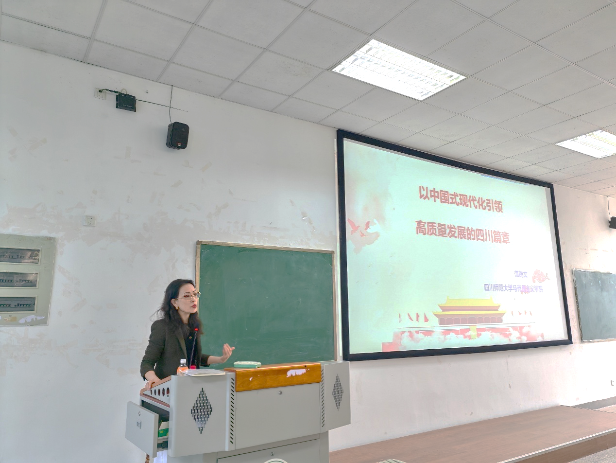 范锡文教授结合党的二十大报告中关于中国式现代化的重要论述,聚焦新时代治蜀兴川实践,从理论逻辑、实践路径与区域特色三个维度展开讲授,系统阐释了“人口规模巨大”“共同富裕”“物质精神相协调”“人与自然和谐共生”“和平发展”五大特征在四川现代化建设中的具体映射,并通过“成渝双城经济圈建设”“清洁能源示范省打造”“天府粮仓科技攻坚”等鲜活案例,生动解读了四川如何以创新驱动、生态优先、城乡融合为抓手,书写高质量发展的时代答卷。