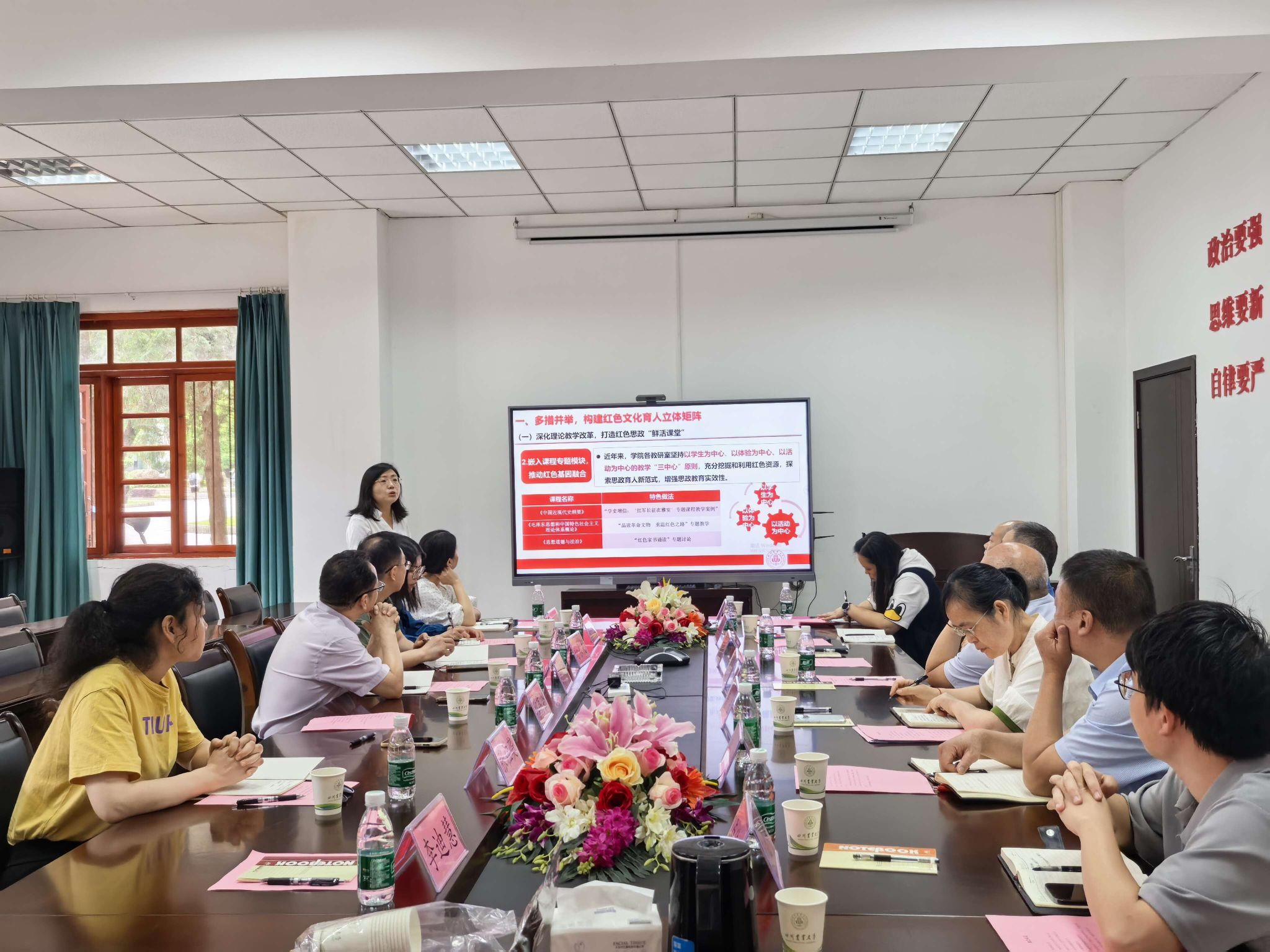 随后,双方在学院会议室举行座谈。雅安市政协文化文史和学习委主任唐利介绍了调研背景,期望通过校地合作,将雅安丰富的红色文化和本土文化更充分、有效地融入高校思政教育体系。马克思主义学院副院长邱高会作了题为“厚植红色基因,谱写育人新篇”的专题汇报,详细介绍了学院在推动雅安红色文化资源融入思政教育方面的具体举措、取得成效、面临挑战及未来规划。