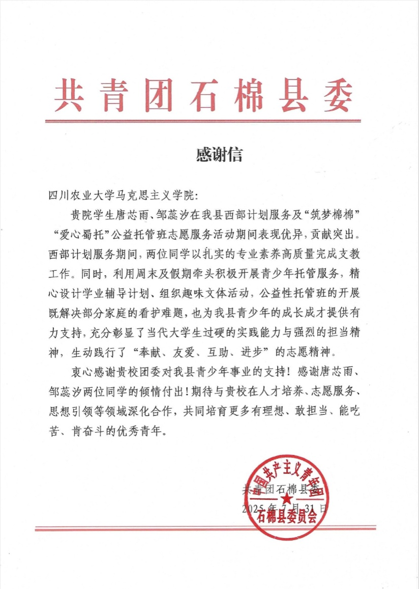 近日,共青团石棉县委向ok138cn太阳集团529马克思主义学院发来感谢信,对我院研究生唐芯雨、邹蕊汐在西部计划服务及当地公益托管班志愿服务中的突出表现予以高度肯定和诚挚感谢,表达了对两位学子的认可与赞誉。