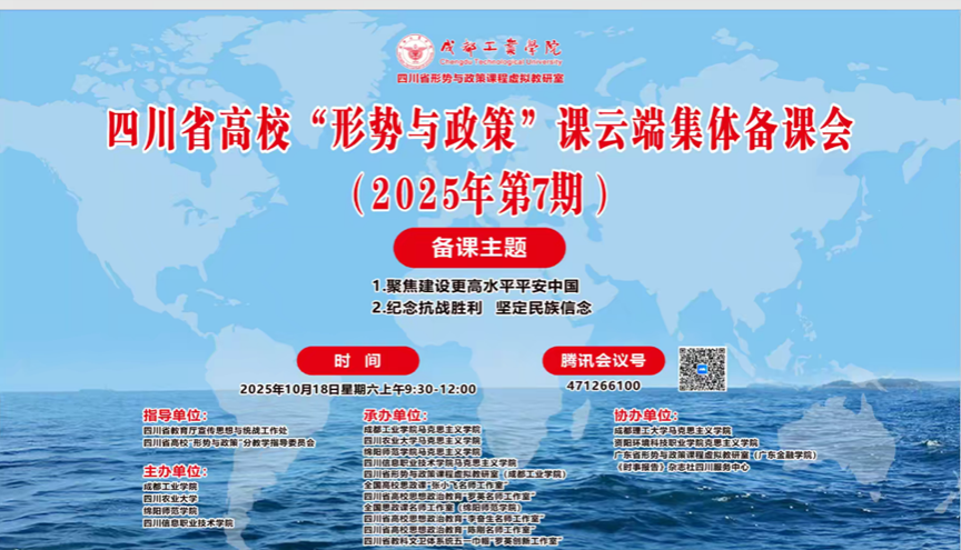 2025年10月18日上午,四川省高校“形势与政策”课2025年第七期云端集体备课会顺利举行。本次备课会由四川省教育厅宣传思想与统战工作处、四川省高校“形势与政策”课分教学指导委员会指导,全省多所高校相关教师参加。学院邱高会副院长出席,形势与政策教研室全体教师观摩学习。