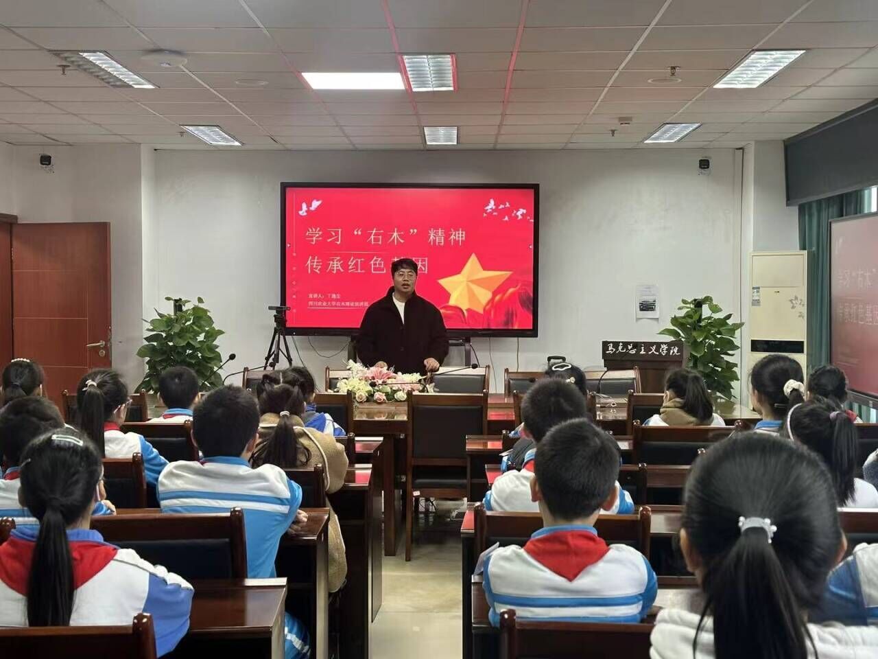 行程的最后一站,同学们安静有序地走进马克思主义学院。在这里,右木理论宣讲团成员以《学右木精神,传红色基因》为主题,深情讲述了四川早期马克思主义传播者、川农大英烈校友王右木的革命事迹。从教育救国到投身革命,从创办马克思主义读书会到建立四川第一个党组织,王右木坚定的信仰与不屈的奋斗,深深打动了在场的每一位孩子。