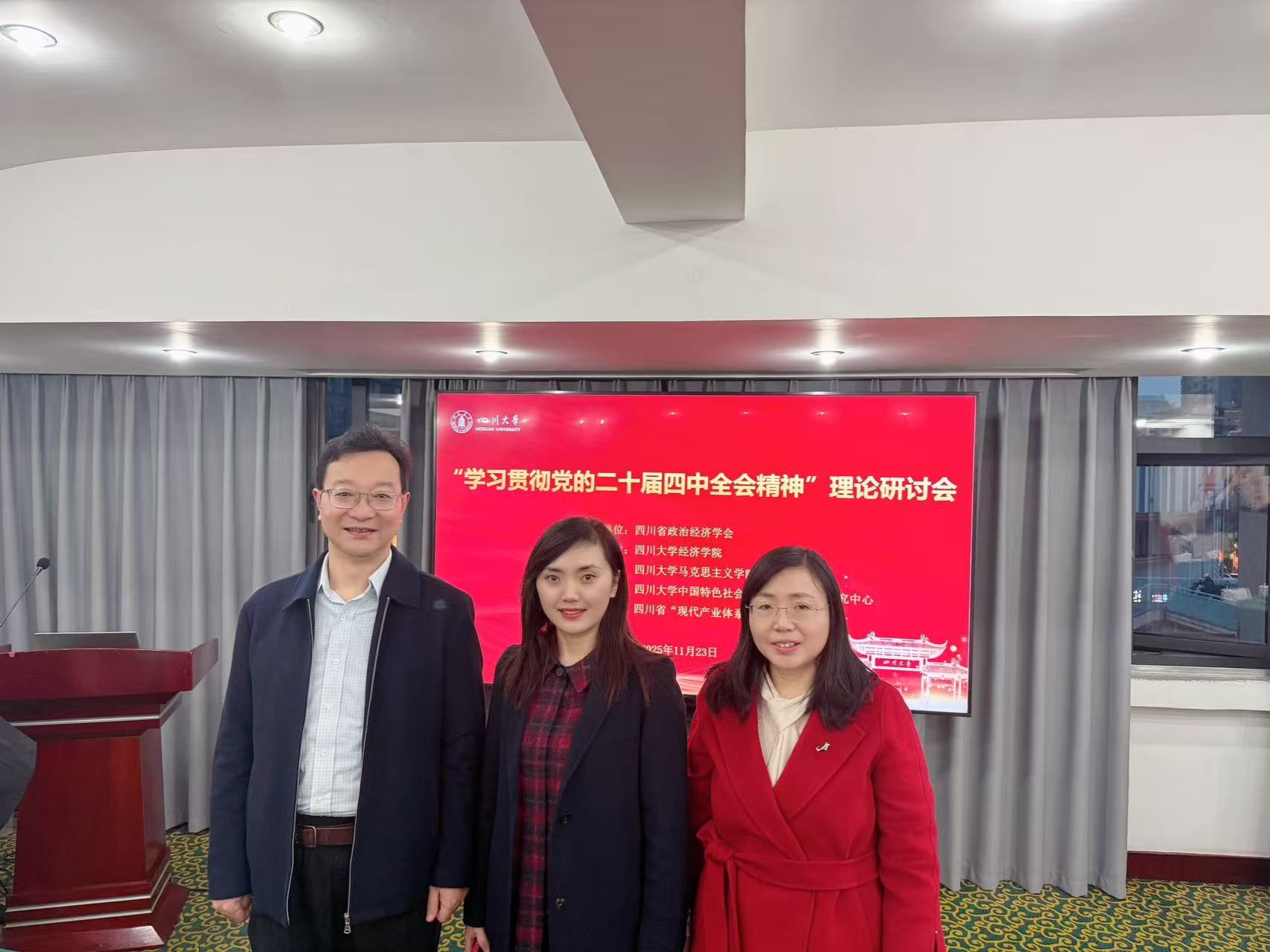 2025年11月23日,由四川省政治经济学会主办、四川大学经济学院等单位承办的“学习贯彻党的二十届四中全会精神”理论研讨会在成都举行。我院院长何思妤教授、副院长邱高会教授受邀参会,围绕全会精神核心要义作交流发言。