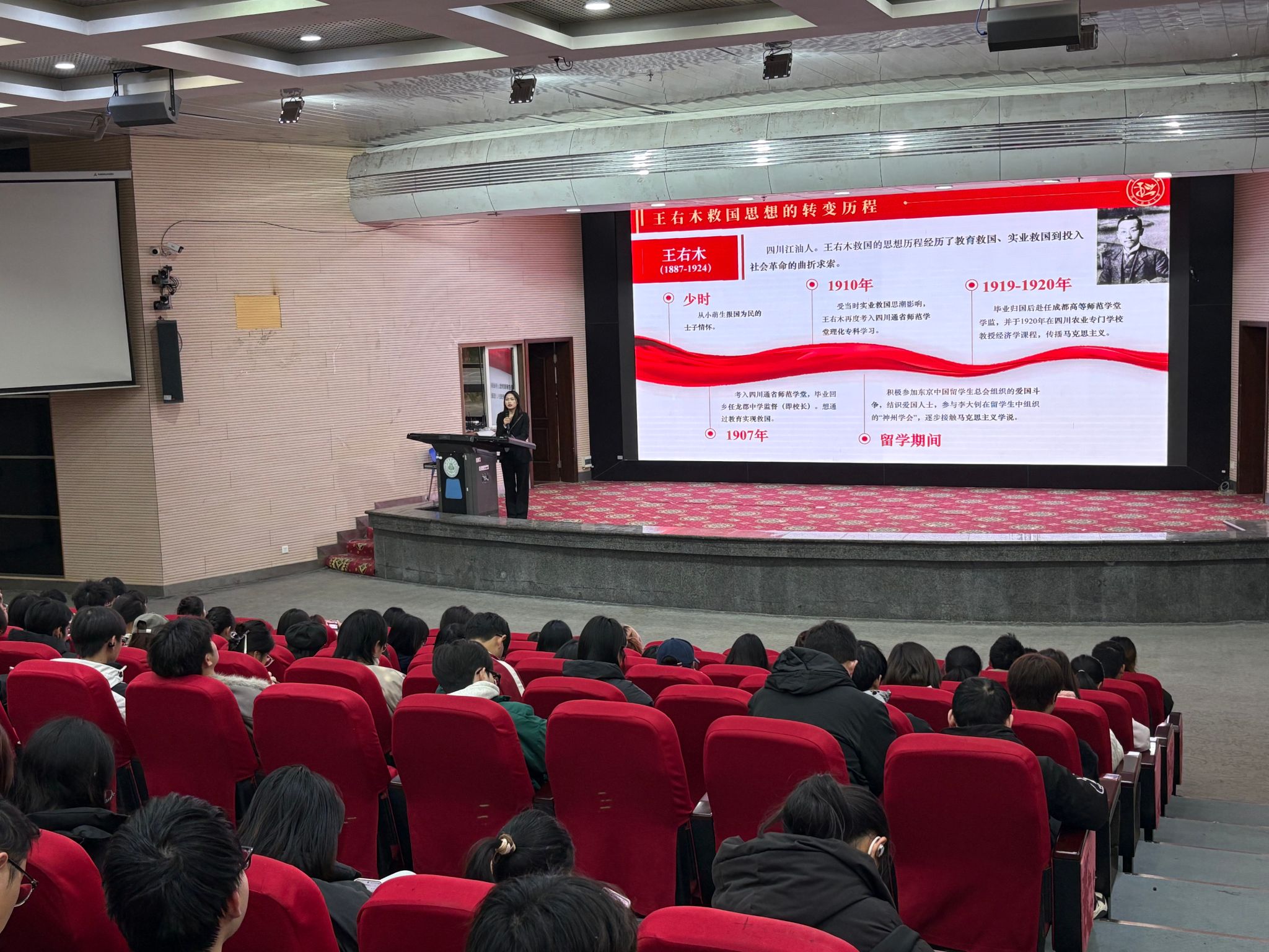 宣讲中,右木理论宣讲团团长任小雨围绕王右木先辈,系统讲述其传播革命真理、推动四川建团建党的奋斗历程。随后,右木理论宣讲团成员王艺桦聚焦吴玉章先辈的革命事迹,深入展现其投身民族解放事业的坚定信念与家国情怀。最后,右木理论宣讲团成员唐芯雨围绕“深学党的二十届四中全会精神”主题展开解读,结合乡村振兴实际,阐述了新时代青年践行全会精神、扎根三农领域的责任与路径,为本科生搭建起理论学习与实践应用的桥梁。