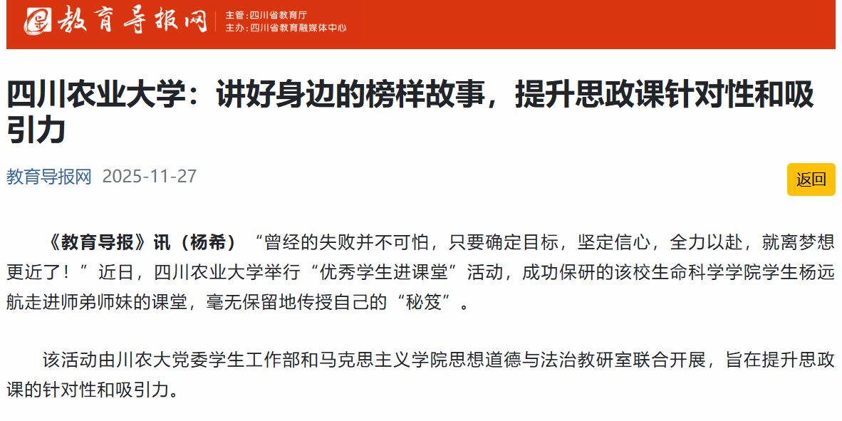 如今,“优秀学生进课堂”活动已举办9届,身边榜样的成长故事感染影响着一代代新生。川农大思政课教师李晓辉说:“我们深入挖掘并展现那些源自平凡生活、贴近学生实际的榜样故事,让榜样不再遥不可及,学生们更容易听进去,也更能受到积极的影响,这就是朋辈教育的力量。”