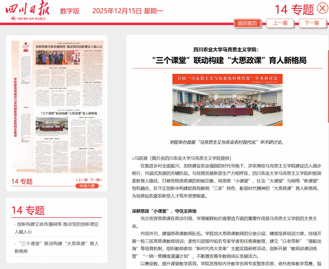 精耕细作,深化教育教学改革。学院出台《推进“思政课程质量提升工程”实施方案(2025—2027年)》,全方位激活思政课高质量发展的内生动力。深度挖掘川农大红色基因和“川农大精神”,出版《大国“三农”发展概论》《中国乡村振兴理论与实践》《校本资源进思政课研究——兴农报国的川农大实践》《巴蜀星火:四川革命先驱的光辉事迹与精神赓续》等教学参考书和案例集10余本,通过讲好身边人和事,增强思政“小课堂”的生动性与亲和力。坚持每学期开展“思政面对面”活动,适时掌握学生学情及课程教学现状;完善常态化联合集体备课机制,强化协同作战、凝聚集体智慧,合力打造一批指导性教学设计和示范性教案;持续打造“一课一品”,不断彰显涉农高校思政课程育人特色。