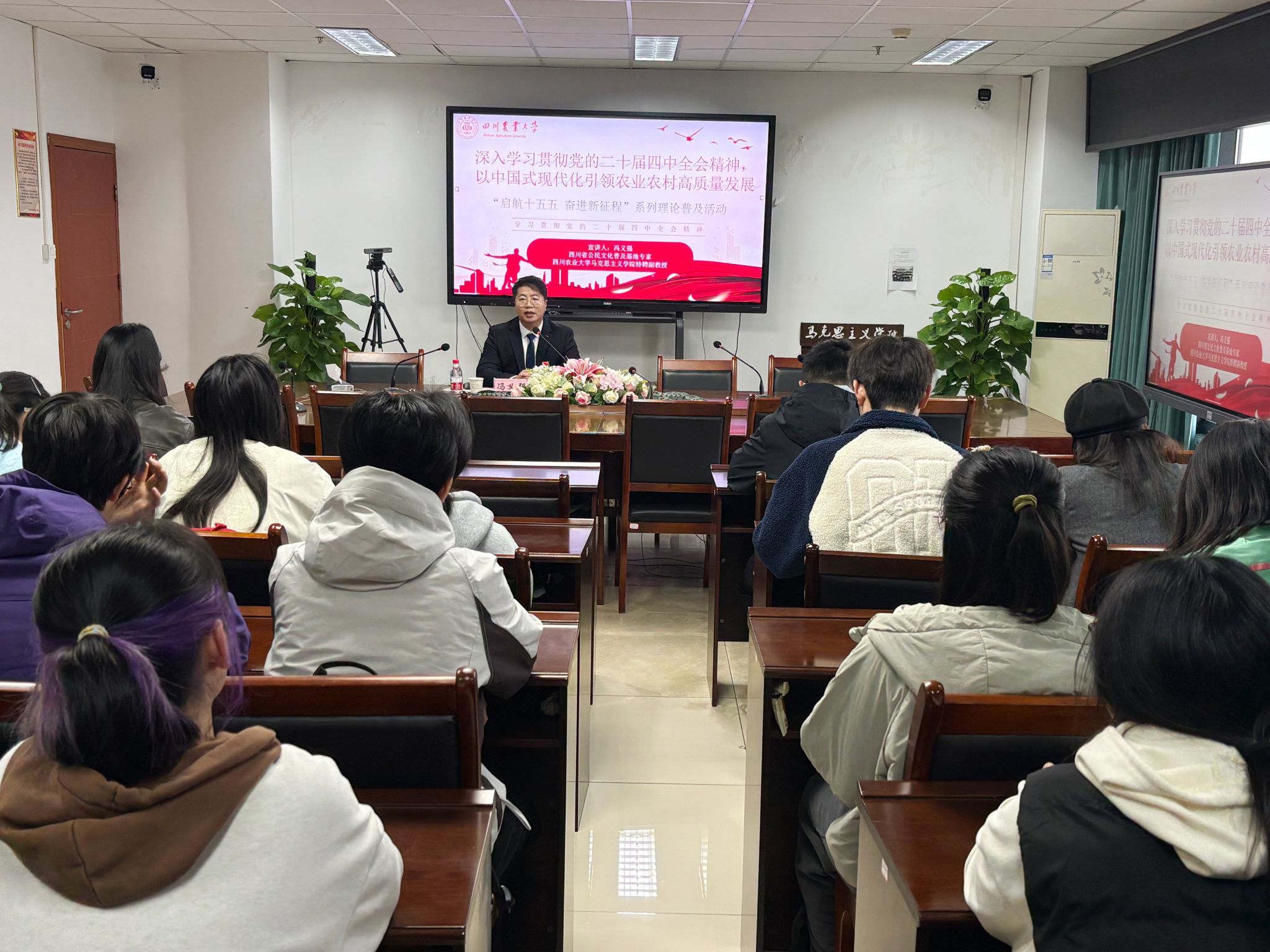 本次宣讲中,冯义强以“深入学习贯彻党的二十届四中全会精神,以中国式现代化引领农业农村高质量发展”为题,系统介绍了党的二十届四中全会的基本情况、《中共中央关于制定国民经济和社会发展第十五个五年规划的建议》的起草过程,详细解读了“十四五”时期我国及四川发展取得的重大成就。他结合习近平总书记2022年、2023年连续两年来川视察重要指示精神,重点阐述了加快农业农村现代化、扎实推进乡村全面振兴的战略部署,指出“农业农村现代化关系中国式现代化全局和成色”,鼓励农科学子勇担时代使命,将论文写在祖国大地上,为农业强国建设贡献智慧和力量。