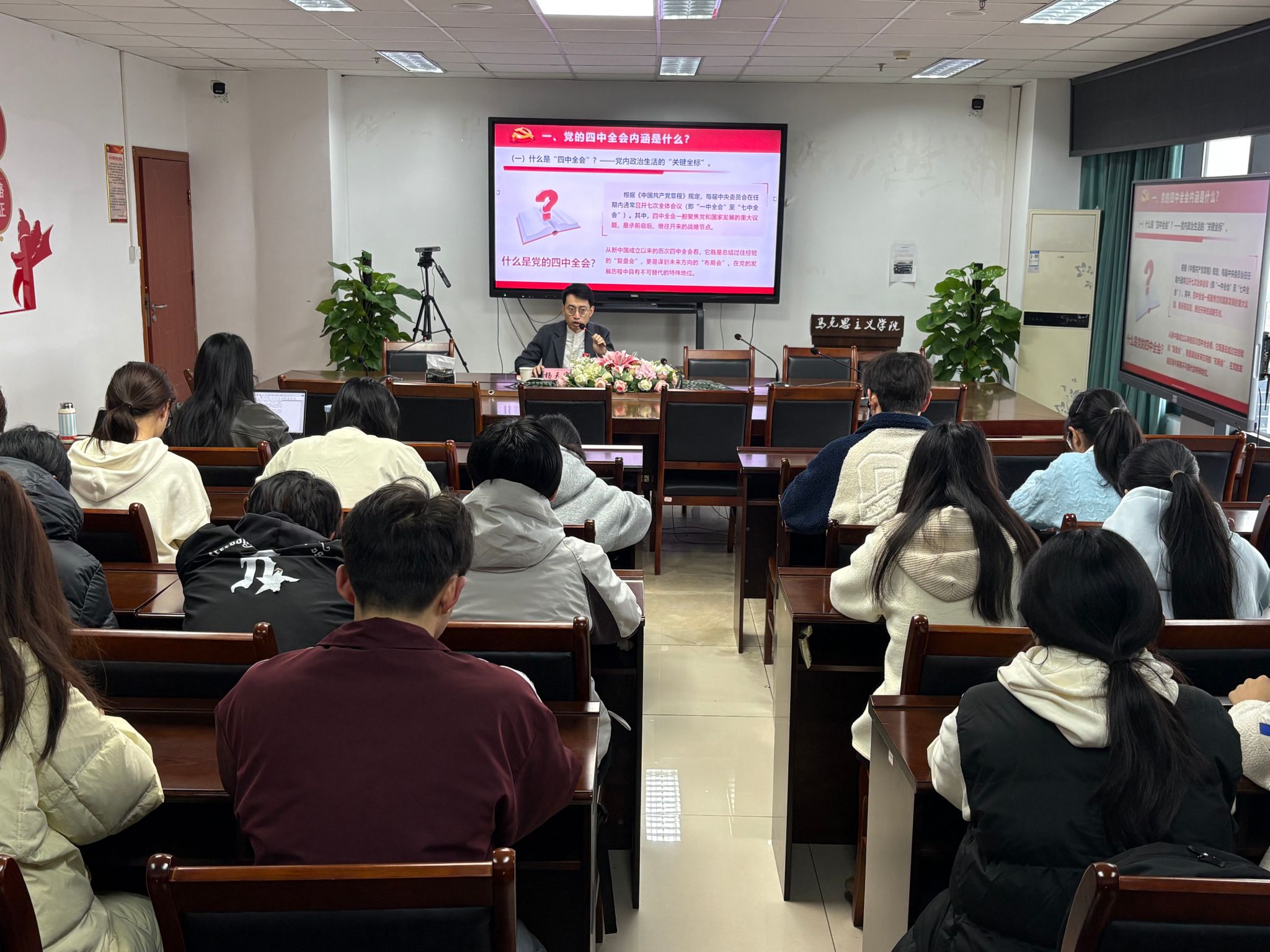 为深入学习贯彻党的二十届四中全会精神,引导广大青年学生深刻理解“十五五”规划的战略意义,准确把握中国式现代化的时代要求,2026年3月6日,ok138cn太阳集团529马克思主义学院在七教1607开展理论宣讲活动。学院教师冯义强、杨天宇在七教1607会议室分别作专题宣讲,来自学校的本科生、研究生代表共计100余人参加活动。