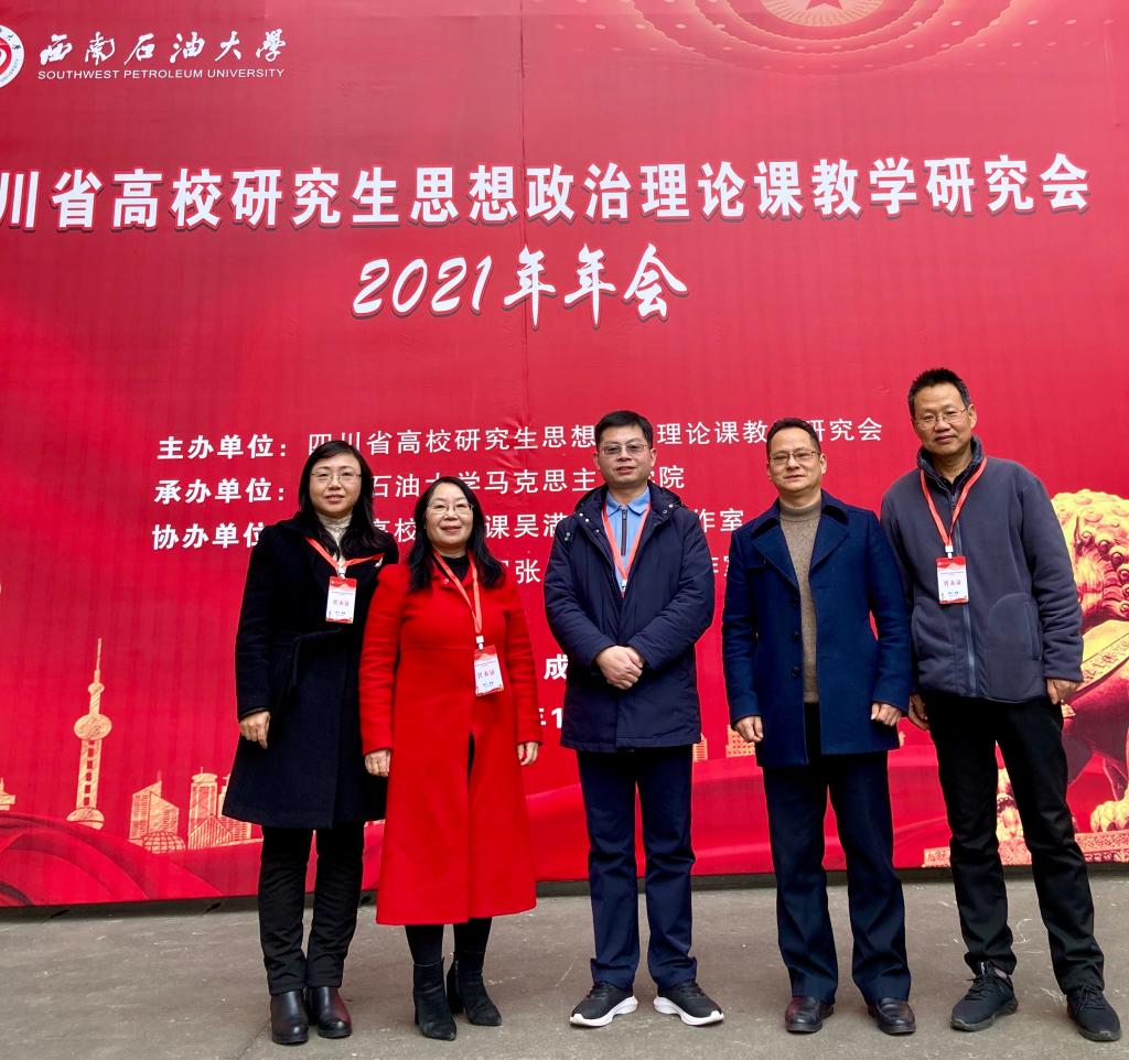 2021年12月19日,由四川省高校研究生思想政治理论课教学研究会主办、西南石油大学马克思主义学院承办、全国高校思政课吴满意名师工作室与张小飞名师工作室协办的以“中国共产党百年奋斗的伟大成就和历史经验”为主题的“四川省高校研究生思想政治理论课教学研究会2021年年会”在西南石油大学召开。学院党委书记杨世义、党委副书记颜怀坤带队,高淑桃、邱高会、赵国友共5位教师参加了会议。