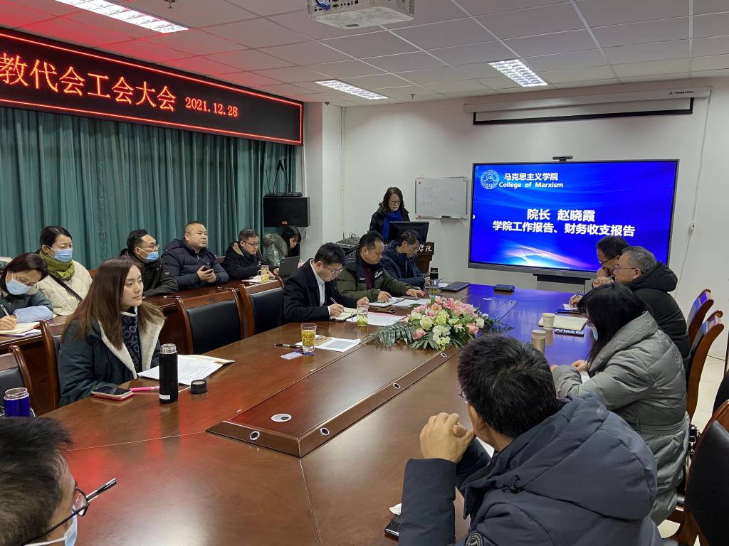 学院副院长何思妤主持工会、教代会全体会议。院长赵晓霞作2021年学院工作报告,通报学院基金使用情况,并对教职工年终奖金分配原则及方案向大会做了报告和说明;工会主席颜怀坤作 2021 年工会教代会工作报告、工会经费收支报告,对教师提案情况作了说明,会议审议并通过了以上内容。