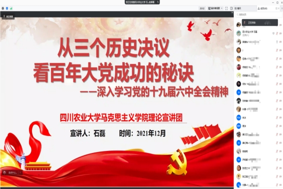 2021年12月12日,马克思主义学院理论宣讲团成员陈天生对我校水利水电学院第六届青马学院精英班进行了党的十九届六中全会及第三次历史决议精神的宣讲,以《聚焦党的十九届六中全会——第三次历史决议》为题,从四个方面进行了详实的内容阐述和解读:一是三次历史决议的对比,二是中国共产党取得的伟大成就,三是中国共产党取得重大历史成就的历史经验总结,四是川农学子的当代责任。本次理论宣讲活动深刻传播了党的领导思想和重大决策,对于增强学生党员“四个意识”、坚定“四个自信”,做到“两个维护”,加强学生党支部思想建设有着重要作用。