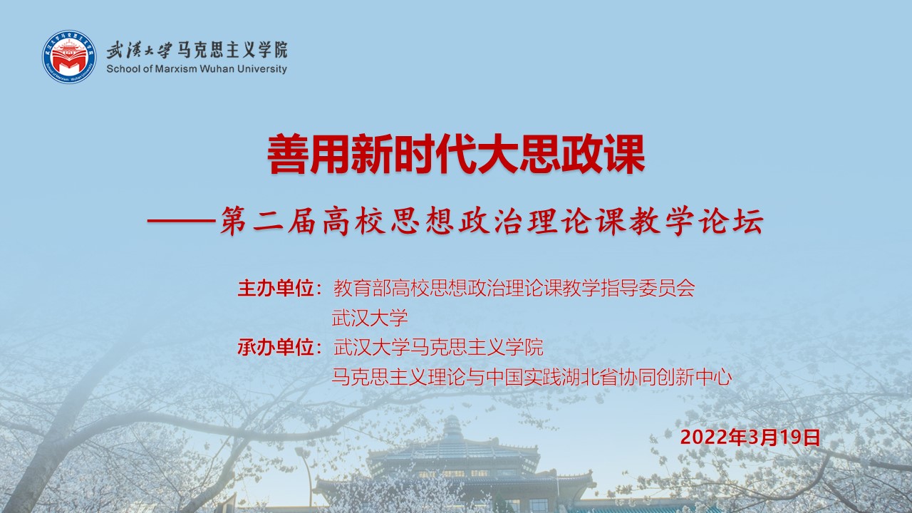 为纪念习近平总书记在学校思想政治理论课教师座谈会上的重要讲话发表三周年,由教育部高校思想政治理论课教学指导委员会、武汉大学联合主办的第二届高校思想政治理论课教学论坛,于2022年3月19日在武汉以线下线上结合的形式隆重召开。这是一次高级别、高水平、高规模的全国高校思想政治理论课程教学研讨学术会议。教育部高校思政课教指委咨委会主任顾海良同志,高校思想政治理论课程权威专家中国人民大学秦宣教授、中国人民大学靳诺教授、北京师范大学王炳林教授、清华大学艾四林教授等出席本次会议。
