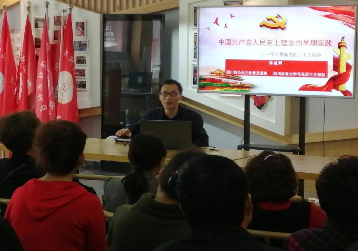 为深入学习贯彻党的二十大精神,马克思主义学院陈建锋副教授于11月11日在成都市桂湖街道为基层党员干部做了题为“中国共产党人民至上理念的早期实践”的宣讲。