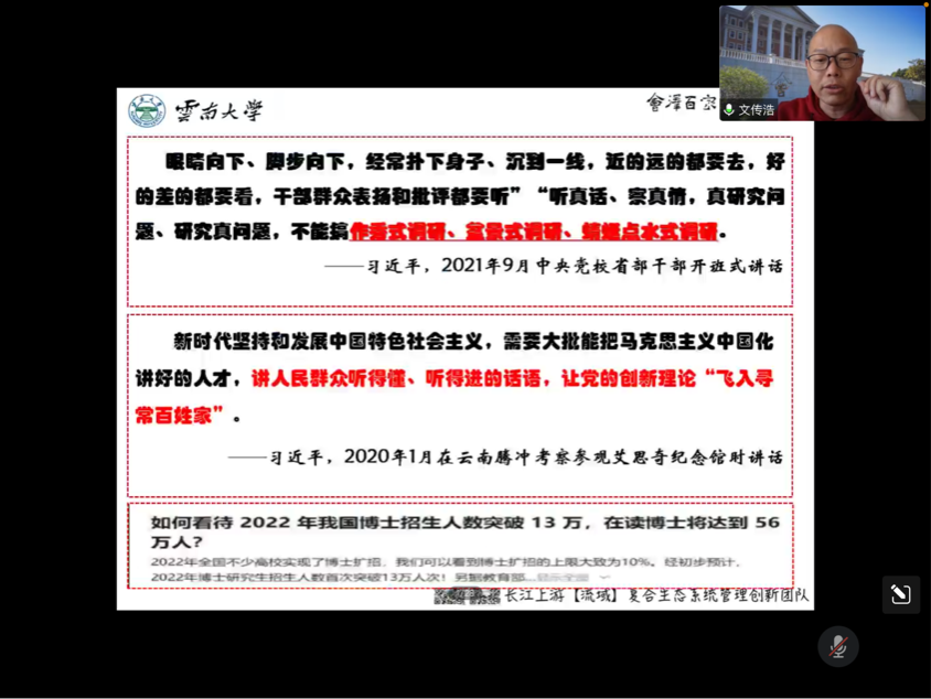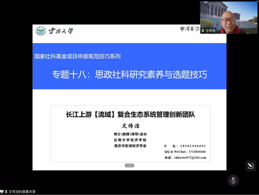 为进一步提升我院师生科研能力,激励广大师生积极投身科研实践,11月24日上午10时,马克思主义学院特邀云南大学经济学院文传浩教授于腾讯会议作了“思政社科研究素养与选题技巧”的专题讲座。学院领导、部分教师和研究生参加,马克思主义学院副院长何思妤主持会议。