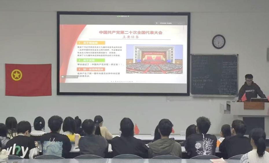 宣讲团成员白博华在商旅学院2021级电商专业4班团支部团日中,以《跳出历史周期率的第二个答案———党的自我革命》为主题,从历史周期率问题切入,向大家讲述习近平总书记在党的二十大报告中对“跳出历史周期率”所给出的第二个答案,并围绕这一命题的理论价值、关于历史周期率的第一、第二个答案——“自我革命”“自我革命”的深刻内涵、时代意义、二者辩证关系展开分享,引导同学们进一步坚定不移跟党走、青春奋进新征程。