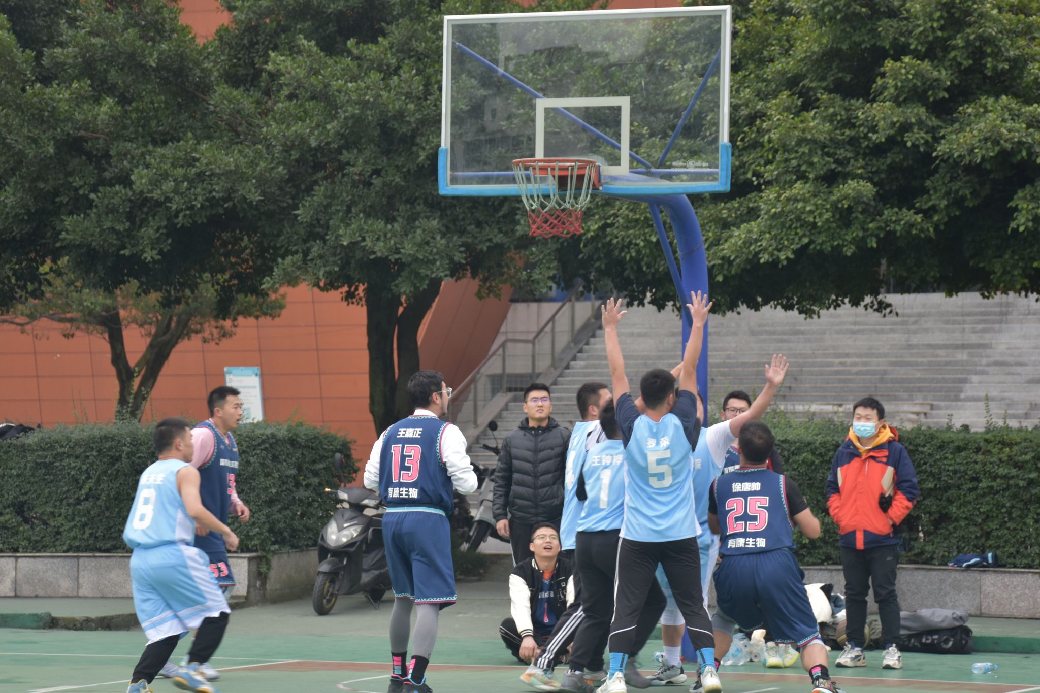 11月30日中午,马克思主义学院男子篮球队在成都校区篮球场对战国家重点实验室篮球队,随着哨声的响起,双方队员迅速进入状态,展开了你争我夺、你攻我守,异常激烈的角逐。男篮队员罗荣看到空档,果断出手,投中三分,罗以恒、张成志守住位置,投出两分,王钟桦连续两次罚球命中4分。我院男篮队员出色的配合以及迅速的回防,动作干净利落,同时场下啦啦队更是热情高涨,呐喊助威,气氛十分活跃。最终马克思主义学院男篮以37:39的比分惜败,但他们“不抛弃、不放弃”的精神感染着在场的每个人,我们依然为他们热烈鼓掌!
