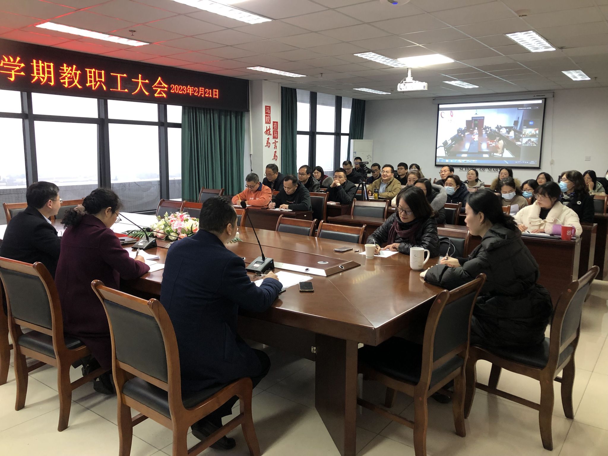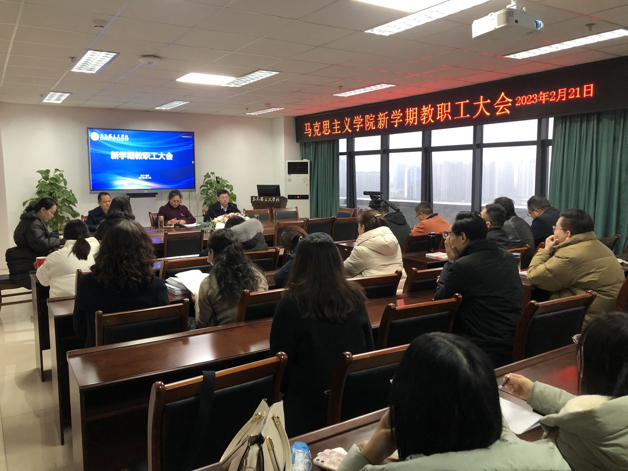 2月21日,马克思主义学院召开新学期教职工大会,院长杨锦秀,党委书记杨世义,党委副书记颜怀坤,副院长何思妤及全体教职工与会。会议由杨世义主持。