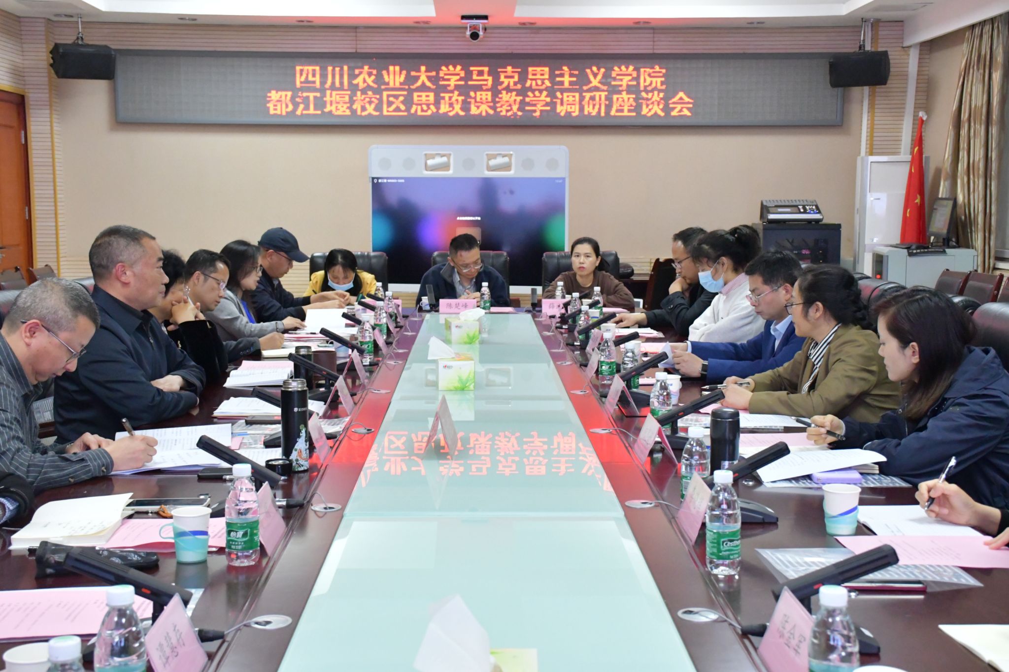 5月9日下午,学校党委常委、统战部长、马克思主义学院院长杨锦秀,学院党委书记杨世义、副院长何思妤、各教研室主任等一行前往都江堰校区开展思政课教学调研。学校学生工作部副部长、都江堰校区党委副书记陈中桂,都江堰校区党委副书记卢昌泰、基础教学部负责人、思政课全体专职教师、兼职教师代表等共同参加本次座谈会。会议由何思妤主持。