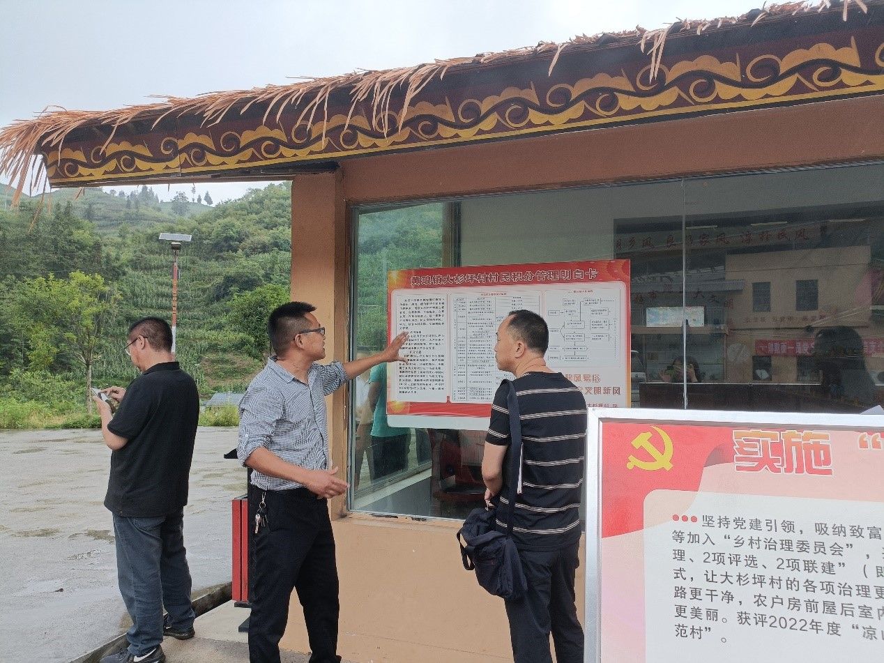 团队走访了解到,移风易俗开展方面,各村落均制定了村庄婚丧嫁娶村规民约,村级成立有红白理事会,红白事都要提前报备。在环境卫生和森林保护上,农户组成“十户联保”,设一保长,十户互相监督。据入户访谈了解,当前各村落移风易俗开展情况良好,广受群众好评。积分制建设方面,团队主要走访了大杉坪村。大杉坪村围绕“产业兴旺、生态宜居、乡风文明、治理有效、生活富裕”的乡村振兴战略总要求,制定了《乡风文明积分管理办法》和5大类、20条的积分奖惩细则,并建立全村农户积分银行数据库,对村民文明行为习惯进行奖励加分,对不文明行为习惯扣取相应积分,并定期公布积分红黑榜。同时设立乡风文明积分超市,定期组织农户用积分银行的积分兑换商品。一年多来,通过推行积分制,有效激发了广大群众的主人翁意识,让大杉坪村的各项治理更有效。邝良峰教授表示未来要向着“数字化+积分制”的治理模式发展,通过小程序或APP等方式,村民可在线查看积分加减明细,村委会也能更高效便捷的开展各项村务活动。