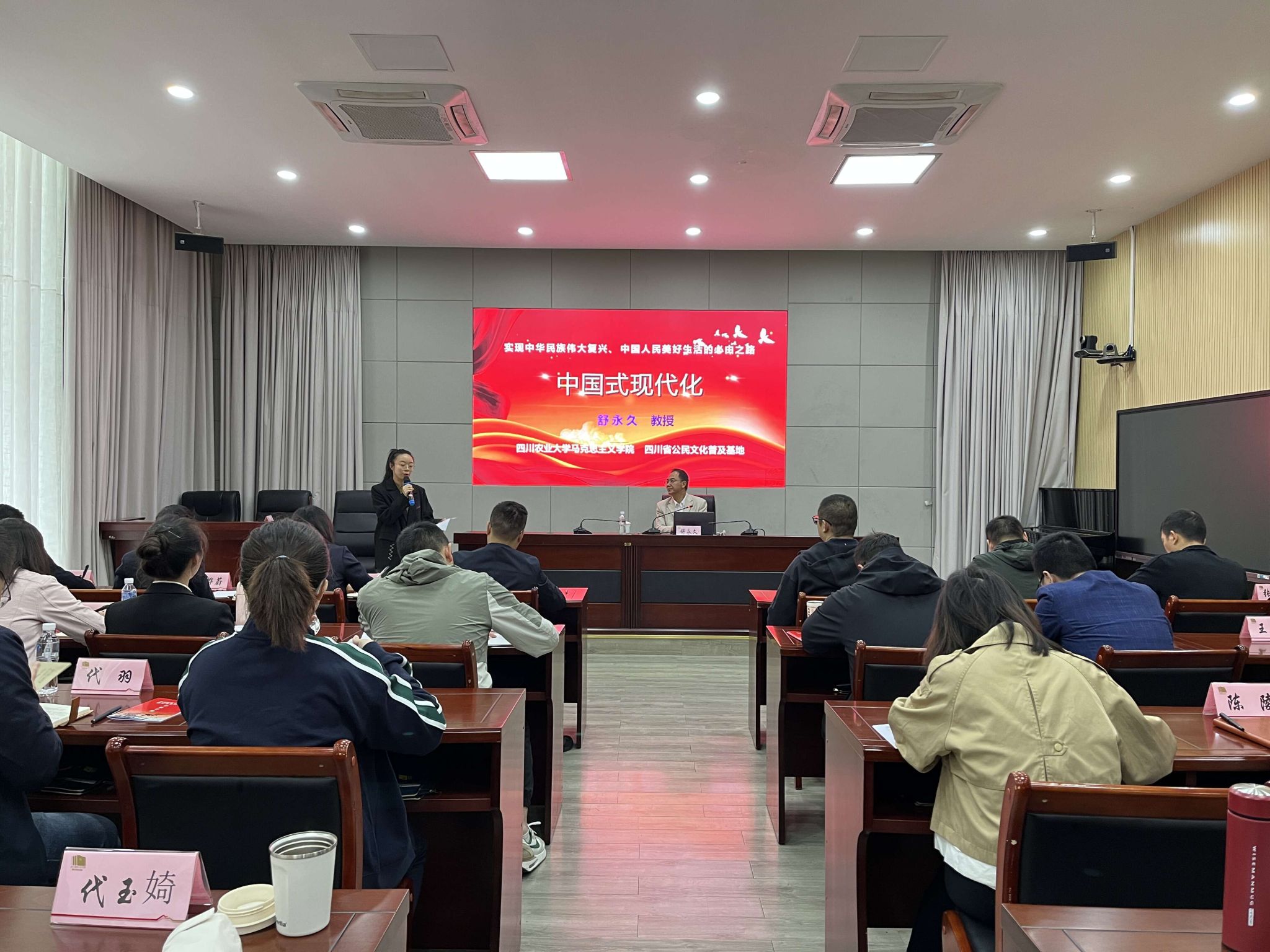 9月24日下午,马克思主义学院舒永久教授受邀到四川长征干部学院雅安夹金山分院,以“中国式现代化是实现中华民族伟大复兴、 中国人民美好生活的必由之路”为题,为来自四川省各地的42名“生态环保铁军”青年干部作了一堂习近平新时代中国特色社会主义思想专题课宣讲。