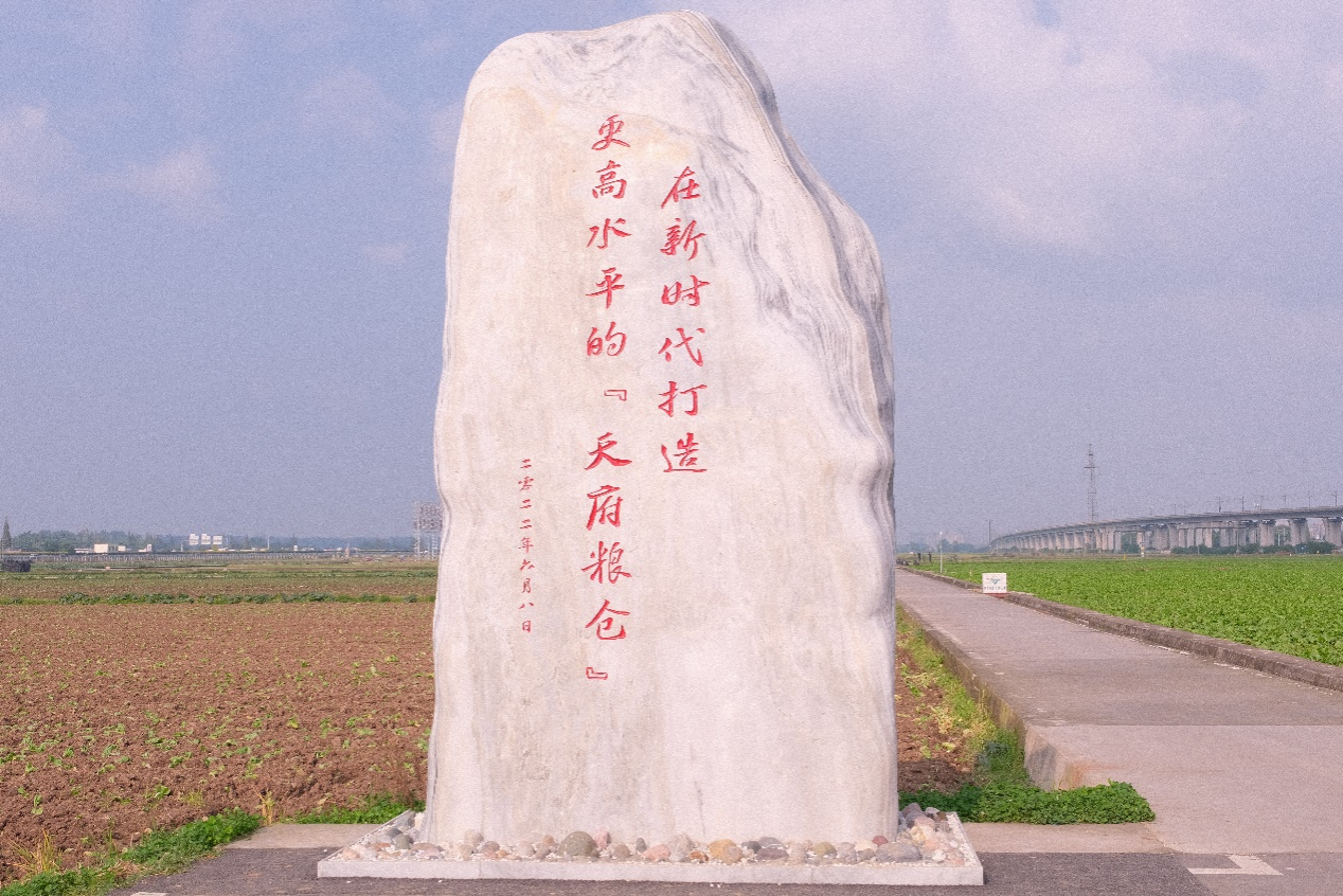 沿着田间小道向前,一块静静伫立的石碑进入师生视野。这块石碑形似大米,碑面书写着十五个鲜红遒劲的大字——“在新时代打造更高水平的天府粮仓”重要指示。