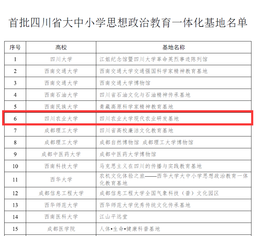 近日,中共四川省委教育工委、四川省教育厅联合公布了首批四川省大中小学思想政治教育一体化基地名单,由我校马克思主义学院牵头,联合基地与实验室管理处共同申报的现代农业研发基地通过认定,成功上榜。