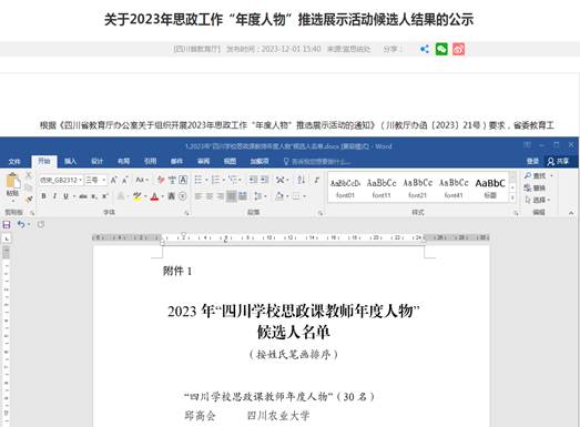 近日,由中共四川省委教育工委、教育厅与省委宣传部组织开展的2023年思政工作“年度人物”评选结果揭晓。学院邱高会教授入选“四川学校思政课教师年度人物”。