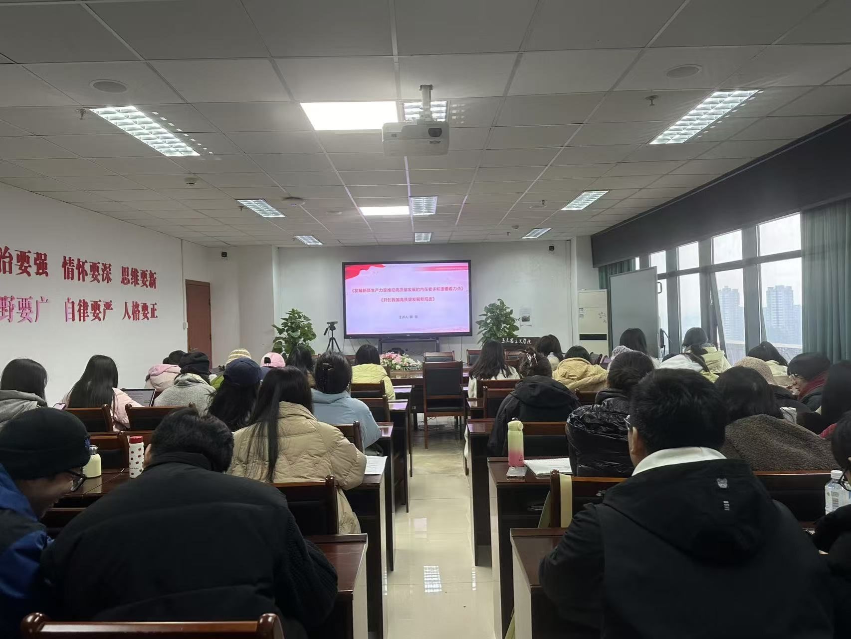 为贯彻落实习近平总书记在学校思想政治理论课教师座谈会上的重要讲话精神,深入学习和贯彻党的二十届三中全会精神,2024年12月25日下午,马克思主义学院组织全体2024级研究生于7教1607观看学习周末理论大讲堂第144期:兰州大学马克思主义学院蒙慧教授主讲《发展新质生产力是推动高质量发展的内在要求和重要着力点》《开创我国高质量发展新局面》(<求是>导学)以及《让思政课成为学生“真心喜欢、终身受益”的课程》,逢锦聚教授主讲《构建高水平社会主义市场经济体制的理论和实践创新》。