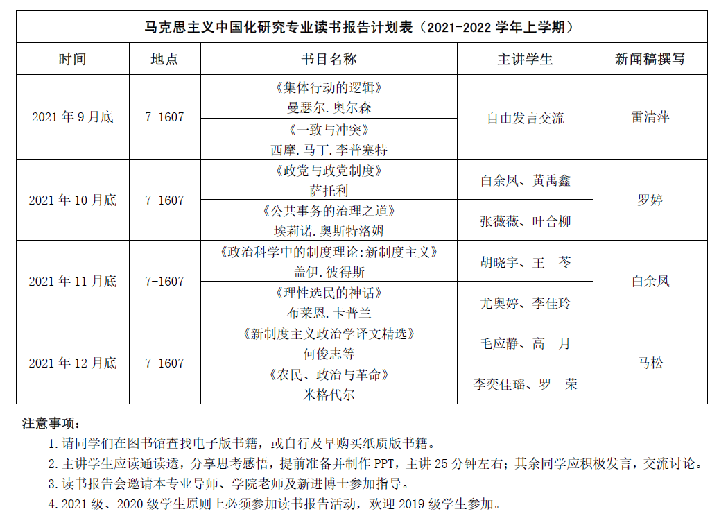 【学科动态】马克思主义中国化研究专业2021-2022学年上学期读书报告安排计划表