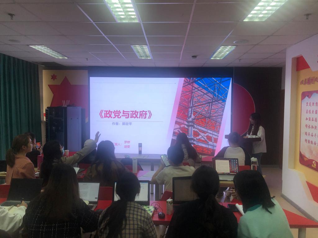 2020级罗婷同学对《政党与政府》全书的框架和概况进行了简要介绍。重点对政党和政府的产生、类型、特征、职能,以及二者的联系和区别作出了清晰的讲解,并对中国共产党的执政机制,加强和改善党对群众团体的领导等多个方面分享了阅读体会。2020级胡雯同学在梳理文章框架的同时,重点从现代化的角度出发,对政党体系构建、战略地位、政治稳定等多个方面展开阐述,并且结合所学专业提出相应的思考和见解。