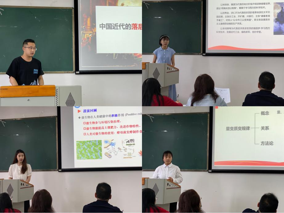 本次有3个学院共4名同学进入初赛,参赛选手自行选择思政课程中的有关章节或专题为主题,用学生的视角、用青春的语言开展“现场教学展示”。来自经济学院的张瑞赫以“探析中国近代落后的原因”为题,基于中外历史的比较视角从中国近代的落后、理论内容、基于中外历史的比较视角与树立正确的历史观四个方面进行教学。第二位选手是经济学院的闫梦蝶同学,她从马克思主义中国化的视角出发,为在场师生讲述了马克思主义中国化的发展历程及重要理论成果。来自动物医学院的黄觅结合专业特色,通过引入“兽医微生物与人类健康”的有关内容,结合中国取得防控传染病阶段性胜利的原因做了生动讲述。最后,由环境学院的甘悦凤同学为大家讲述了“马克思主义基本原理”中的“量变质变规律”,从概念、关系及方法论由浅入深地进行教学展示。各位选手引经据典,结合时事,将理论与实践结合,在知识与现实的互动中展示了教学风采。
