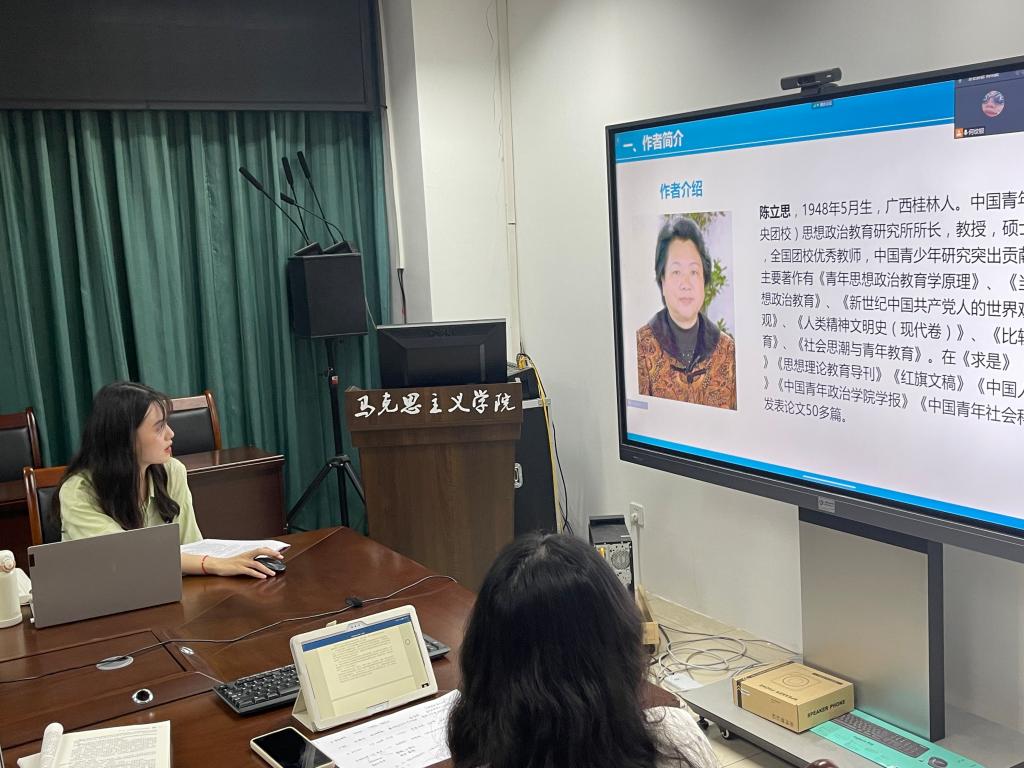 第一位主讲人为2020级的刘珺瑶同学,她首先阐述了思想政治教育比较与比较思想政治教育的区别,对作者陈立思进行了相关介绍。随后,刘珺瑶着重阐述了《比较思想政治教育》的主要内容,运用“整体与部分”的辩证关系和方法论,先从宏观上划分了本书的框架结构,之后对本书每一章节的内容进行了概括和整理,对本书的重点内容进行了梳理,详细介绍了主要资本主义国家的思想政治教育特点、内容、手段,阐述了各国政党与青年组织以及欧洲委员会、欧洲联盟的青年工作。最后,刘珺瑶同学在研读书本之后,提取了“党的领导”、“青年”、“社会组织”、“教育内容”作为本书的关键词,结合思政专业研究生的学习体验,分享了她在阅读书本之后的收获和感悟。