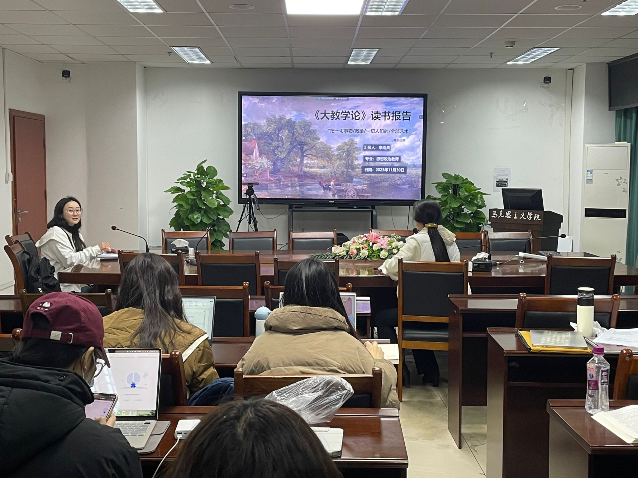 2023年11月30日19:30,思想政治教育专业读书报告会在七教1607会议室顺利举行。本次报告主要围绕夸美纽斯所著的《大教学论》一书展开分享交流。张禧老师、袁志香老师出席了本次读书报告会,思想政治教育专业2022级、2023级全体研究生参会。
