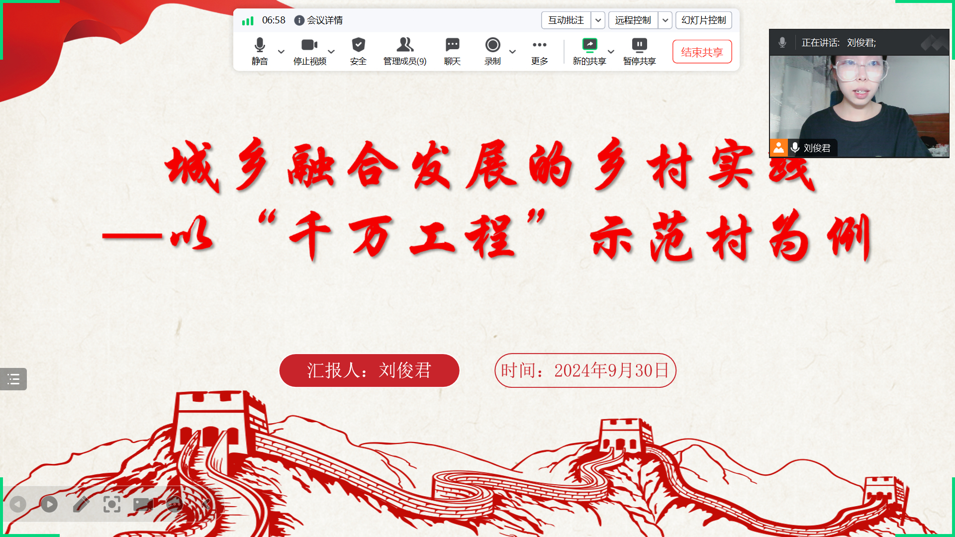 为全面理解党的二十届三中全会精神,把城乡融合发展相关理论讲深讲透、落实落细。2024年9月30日,ok138cn太阳集团529右木理论宣讲团成员刘俊君面向四川省图书馆党支部开展了“城乡融合发展的乡村实践——以‘千万工程’示范村为例”的主题宣讲。