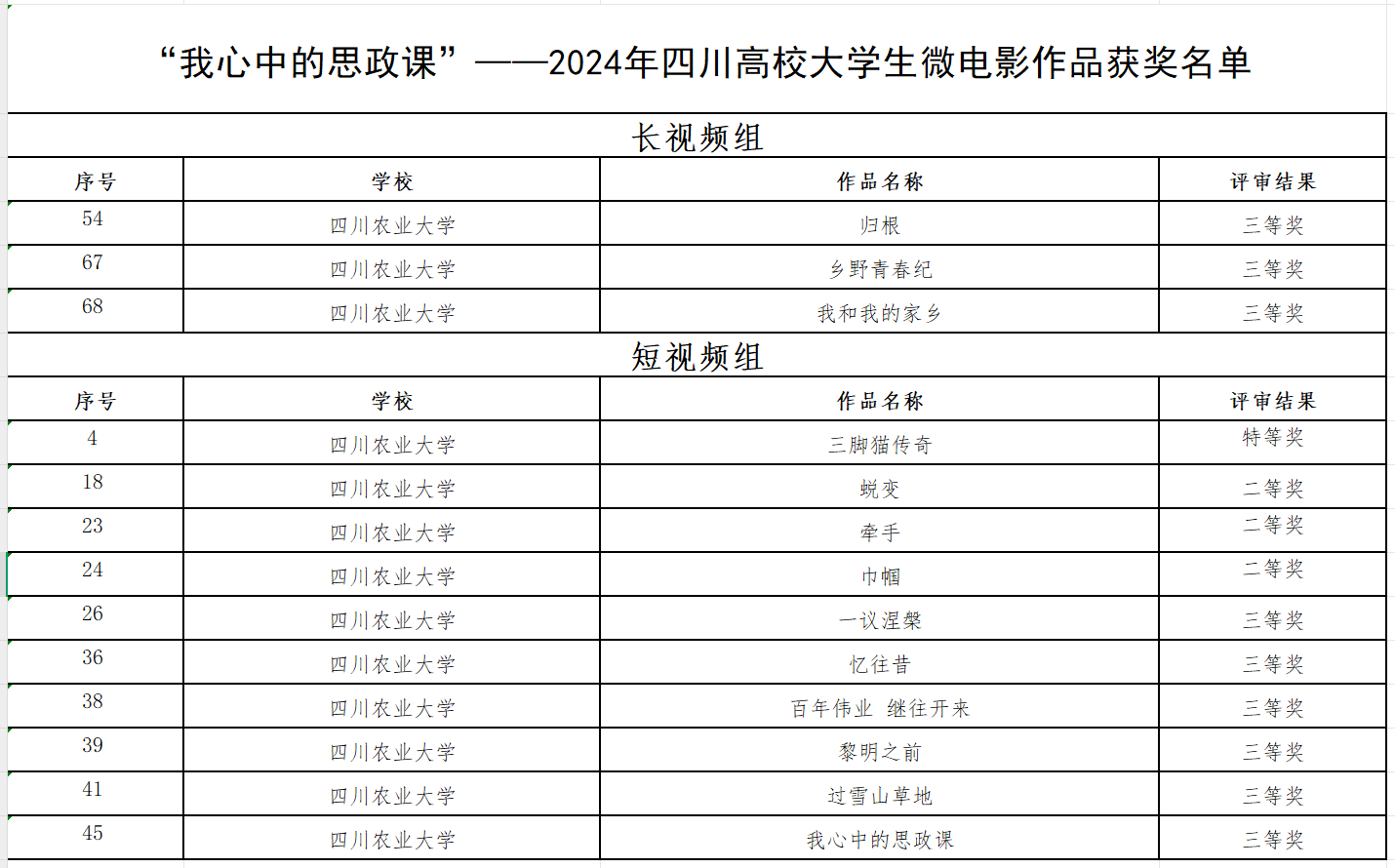 活动期间,我校马克思主义学院积极参与指导组织工作,组建指导教师团队,把好政治关、内容关、格调品位关;学生团队在教师指导下巧妙构思、精心打磨、突出亮点。经过作品创作、校级选拔、打磨推选和省级评审四个阶段,最终在“2024年四川高校大学生讲思政课公开课”活动中,我校推送的《向 “新” 而行,“生生” 不息》《丰景如画绘新村,以人为本铸辉煌》《乡村有 “羌调”,振兴有 “门道”》获省级特等奖;《血性映征途》《了不起的朋友》《广开食源 践行大食物观》获省级三等奖。在“2024年四川高校大学生微电影作品”活动长视频组中,我校推送的《归根》《想也青春纪》《我和我的家乡》省级三等奖;在“2024年四川高校大学生微电影作品”活动短视频组中,我校推送的《三脚猫传奇》获特等奖;《蜕变》《牵手》《巾帼》获省级二等奖;《一议涅槃》《忆往昔》《百年伟业 继往开来》《黎明之前》《过雪山草地》《我心中的思政课》获省级三等奖。