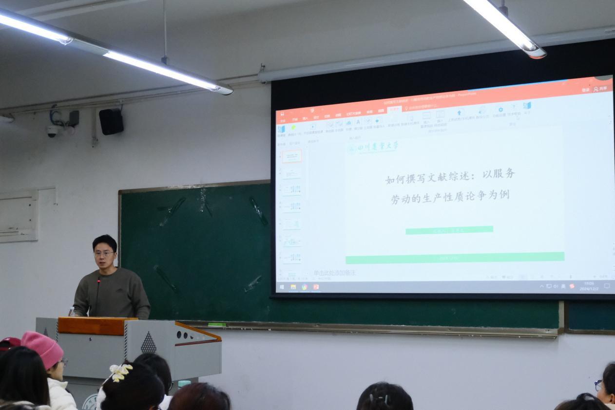 12月2日晚,马克思主义学院为进一步提升研究生的学术素养和论文写作能力,营造浓厚的学术氛围,学院“专家/青年博士论坛”第八讲于4-b106教室顺利举行,本次论坛特别邀请学院青年教师易恩文博士,作了题为“如何撰写文献综述:以服务劳动的生产性质论证为例”的报告。此次论坛由学院研究生教学部主任熊小果主持,2023、2024级全体研究生积极参与。