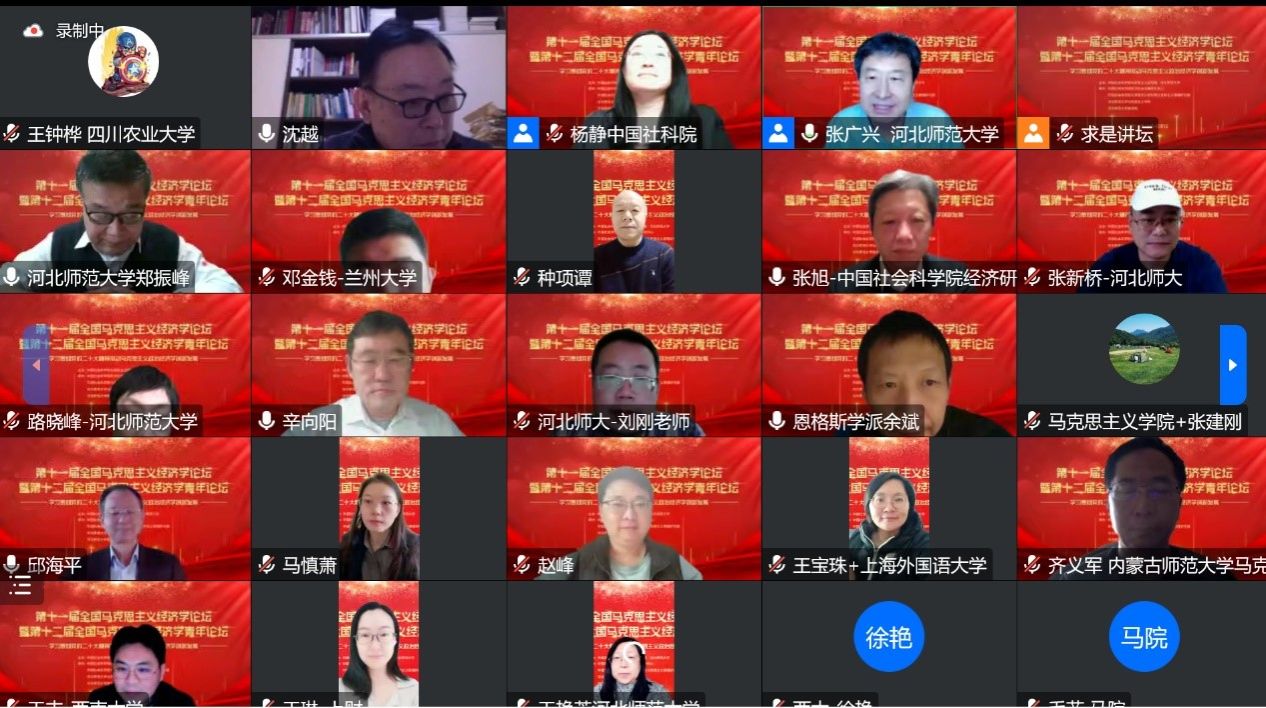 在学习贯彻党的二十大精神之际,12月18日,由中国社会科学研究院马克思主义理论学科建设与理论研究工程、中国社会科学院马克思主义研究院、河北师范大学联合主办的第十一届全国马克思主义经济学论坛暨第十二届全国马克思主义经济学青年论坛在河北师范大学举办。学院学生王钟桦线上参会。本学术论坛采取“1+4+3”的交流研讨模式,即主旨报告、4个平行分论坛报告、3个学术交流会等三个环节。论坛开幕式由中国社会科学院马克思主义研究院党委书记辛向阳致词。