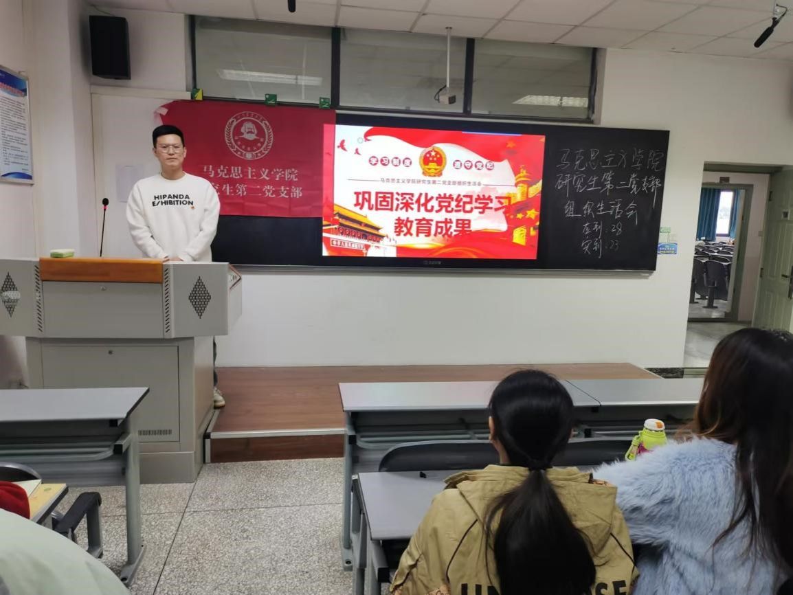 党的纪律是党的生命线,纪律教育是牢牢守护生命线、让党永葆生机活力的重要举措。为引导党员同志理解和执行党的纪律,在遵规守纪的前提下努力学习、锐意进取、积极作为,将纪律规矩转化为政治自觉、思想自觉和行动自觉,11月18日下午,马克思主义学院研究生第二党支部在四教C-612教室召开了“巩固深化党纪学习教育成果”专题组织生活。会议由郭泽巍同志主持,全体党员参加。