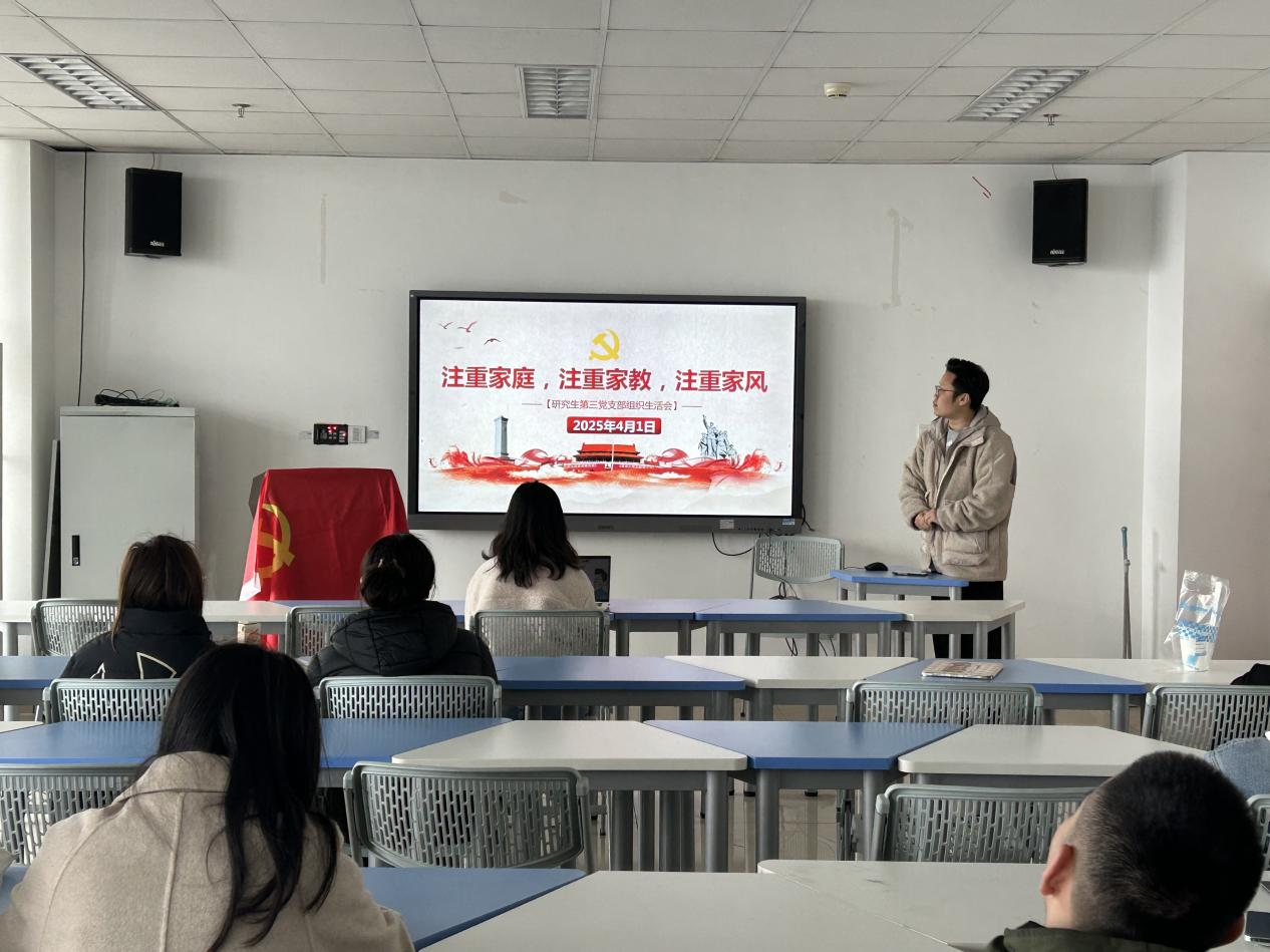 为强化党员的家庭责任感与社会使命感,弘扬党的优良传统和作风,4月1日下午,马克思主义学院研究生第三党支部于7教1605会议室召开了“学习领会习近平总书记关于注重家庭家教家风建设的论述和中央八项规定精神”专题组织生活。会议由姜旭东、陈遥逸同志主持,支部全体党员参加会议。