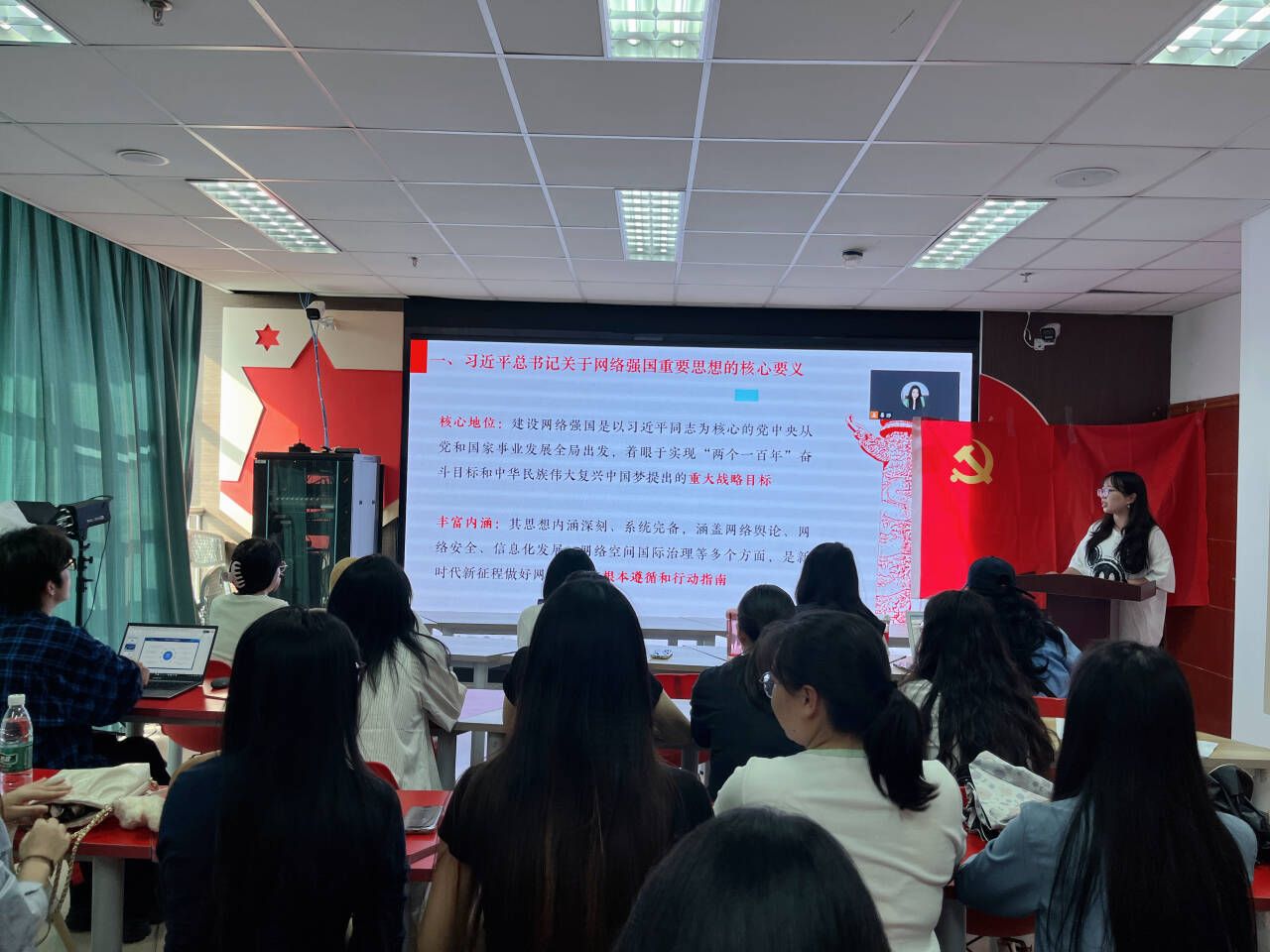 会议伊始,周婷婷同志指出,在全球信息化浪潮深入发展的背景下,全面理解网络强国战略的深远意义尤为迫切。她强调,本次组织生活旨在引导党员同志进一步增强对网络时代国家治理、意识形态安全和经济发展等重大议题的认知,主动适应时代变革,提升网络素养。随后,周婷婷同志带领全体党员围绕“习近平总书记关于网络强国的重要思想核心要义”“习近平总书记对网络安全工作‘四个坚持’的重要指示”以及“相关重要法律法规核心内容”等方面展开系统学习。她指出,作为马克思主义理论专业的研究生,应当在理论层面深化对网络强国战略的理解,更要在实际中增强网络辨别能力,主动发声、善用网络传播正能量,积极参与清朗网络空间建设,服务于国家治理体系和治理能力现代化。