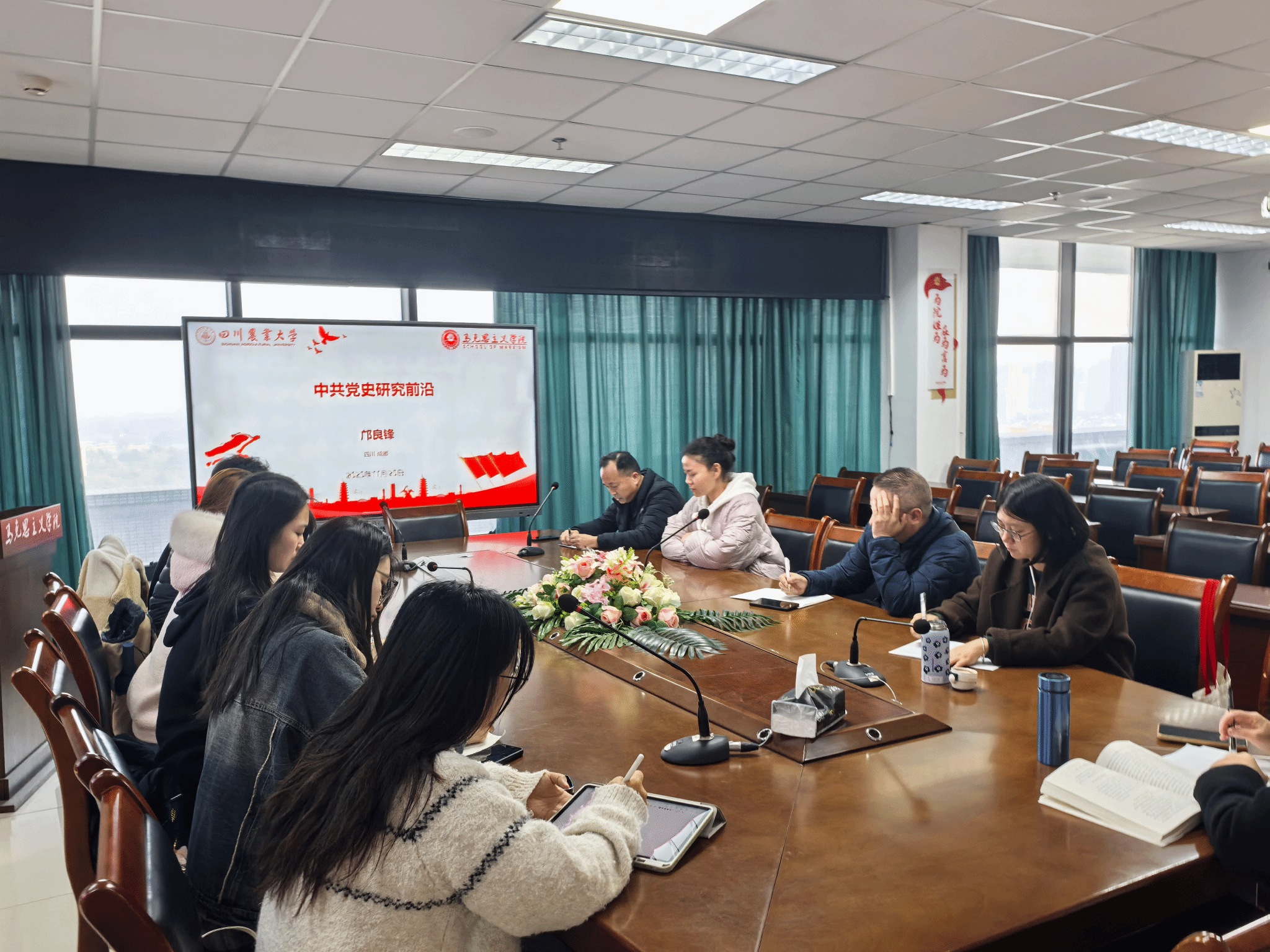 为深入学习贯彻党的二十届四中全会精神,2025年11月25日下午,中国近现代史纲要教研室教工党支部在7教1607召开专题党组织生活暨集体备课会。会议由教研室主任张祖龑教授主持,学院副院长邱高会教授、马克思主义中国化学科负责人邝良锋教授出席会议,马克思主义基本原理学科负责人舒永久教授线上旁听会议,教研室成都校区全体教师和部分2025级中国近现代史基本问题研究方向硕士研究生参加会议。