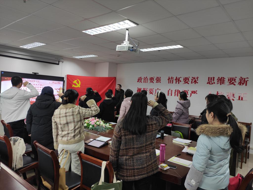 首先,支部进行了新接收预备党员宣誓仪式。罗荣带领支部党员重温了入党誓词。全体党员精神抖擞,高举右拳,面对党旗,庄严宣誓。入党宣誓仪式后,党支部新接收的预备党员张媛媛发言表态:通过此次宣誓仪式,自己的党员身份意识更加强烈。今后我仍将会在思想、工作、生活等方面继续努力,不断前进。请党组织继续培养和考察。