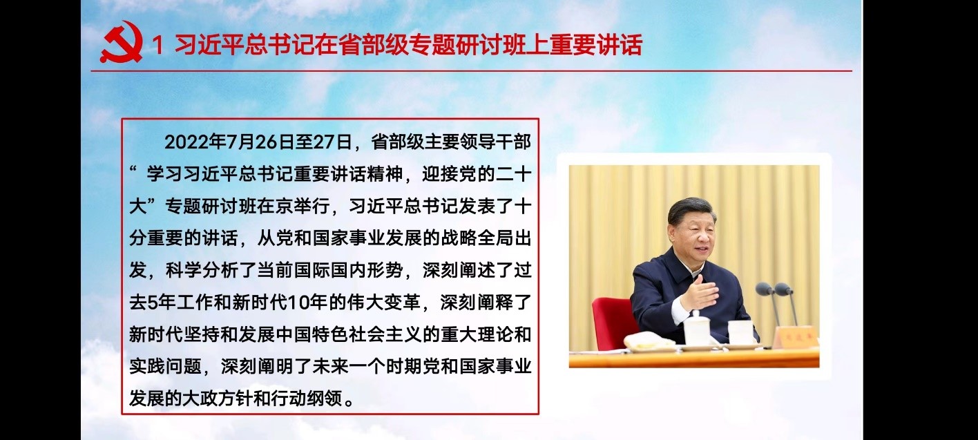 张媛媛首先就“习近平总书记在省部级专题研讨班上重要讲话”进行了领学,重点阐述了其六个方面的主要内容,同时深入讲解了习近平总书记关于“赶考”的重要论述,并以视频形式系统回顾了中国特色社会主义进入新时代以来党和国家取得的重大成果。