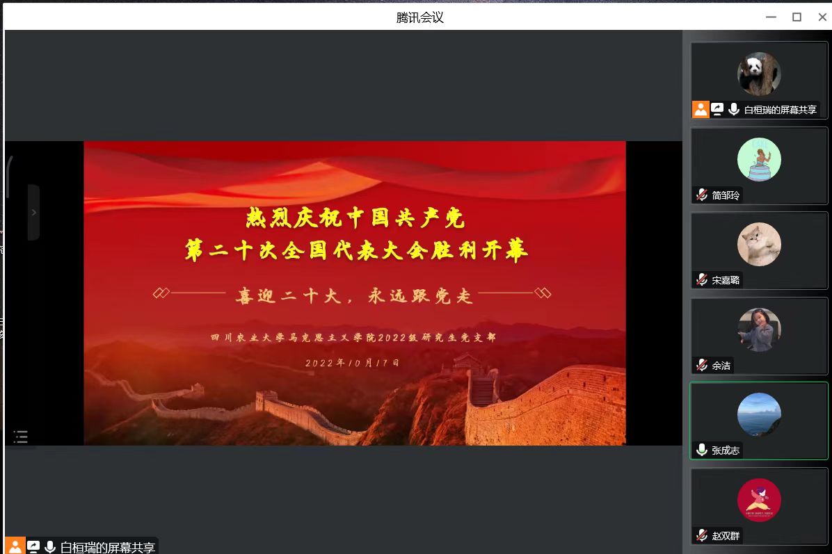 10月18日,学院2022级研究生党支部于腾讯会议线上召开了“热烈庆祝中国共产党第二十次全国代表大会胜利开幕”主题分享交流会。会议由党支部书记白桓瑞同志主持,2022级全体在校研究生党员参与并讨论。
