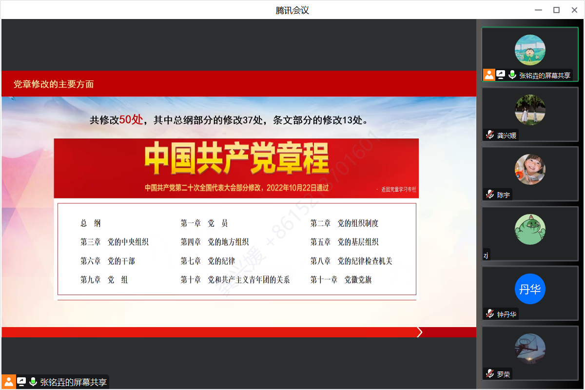 党章是立党、治党和管党的总章程,是全党的行为规范和根本遵循。2022年10月22日,党的二十大审议并一致通过了《中国共产党章程(修正案)》,将新时代党的理论创新成果及时写入党章,实现了党章的与时俱进。领学人张铭垚从党章修正的意义着手,以循序渐进地方式回顾了党章修改的历程,在学习过程中帮助支部全体党员充分理解了“党内民主”的内涵,把握了党章修正的鲜明特点。紧接着,领学人结合中国共产党鲜活的治国理政经验与高度的战略谋划智慧,对党章修订的11个方面主要内容进行了详细讲解,层层剖析,字句对比,带领支部全体党员对最新版《中国共产党章程》学深学透。最后,领学人对党章修改的新时代价值进行了总结。支部书记罗荣在集中学习之中,结合新版党章中对党员义务所修订的“增强‘四个意识’、坚定‘四个自信’、做到‘两个维护’”这一内容进行了规矩意识教育专题辅导。罗荣强调:“学习党章要坚持学用结合,学以致用,履行好党员的义务,做到学党章、守规矩、明道理。”罗荣寄语支部全体党员同志:“希望大家牢记自己的学生党员身份,珍惜求学生涯的最后时光,在这一段时间内更加发挥好党员的模范作用,以严的标准、高的要求、实的作风来约束自己,做到表里如一,言行规范。”