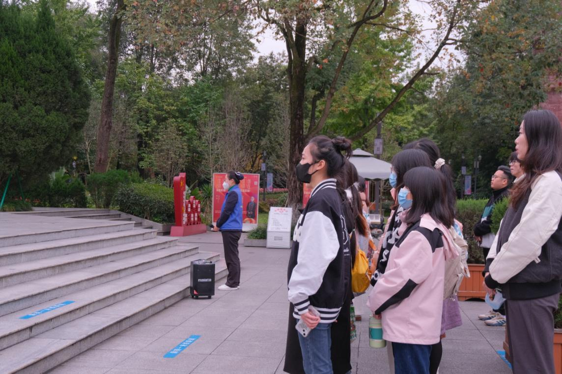 在庄严肃穆的烈士墓前,讲解员带领同学们齐唱国歌并默哀,向先烈致以最诚挚的敬意。随后讲解员向同学们讲述了先烈的英雄事迹,在这些烈士中,有二十年代初留法勤工俭学时加入中国共产党,回国后任中共重庆地方委员会委员并长期从事党的文化工作和上层统战工作的杨伯恺烈士;有在一九二六年英军炮轰万县的九·五惨案中英勇抗英闻名中外的爱国军人,后来又长期从事党的秘密活动的于渊烈士;有在国民党反动派“四·一二”反革命政变后的腥风血雨中,打响川西工农第一枪,领导过绵竹暴动的旗手王干清烈士等。他们是在共和国成立之后,成都即将解放时被丧心病狂的反动派杀害的,用刺刀、手枪、铁铲,一个一个地把他们活埋,残杀于十二桥附近的防空壕里。