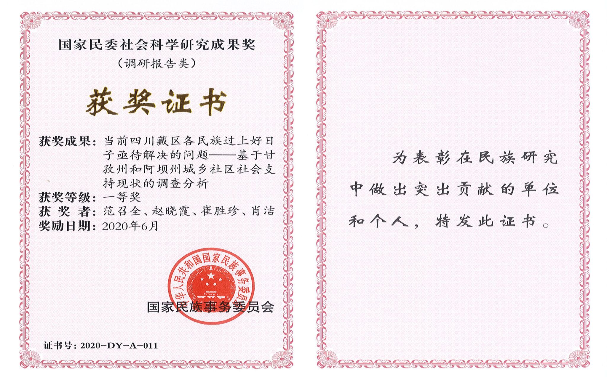国家民委社会科学研究成果奖一等奖