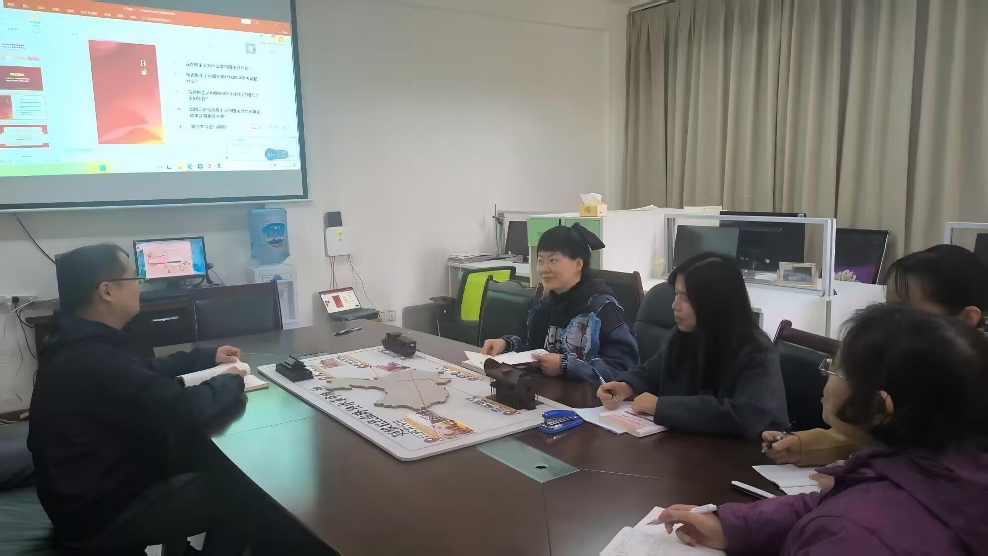 在PPT授课设计研讨环节,教师们逐一展示了各自制作的导论部分PPT讲课稿,并从内容排版、视觉呈现、素材选取等方面进行互评互议。针对部分PPT存在的理论如何更好地下沉现实的问题,大家共同探讨解决方案。例如,有教师提出,将地方党史与导论中的马克思主义中国化时代化理论相衔接;还有教师建议,通过插入短视频、数据图表等形式,让内容更具直观性和吸引力。经过充分讨论,教研室确定了导论视觉的统一设计思路与优化方向。